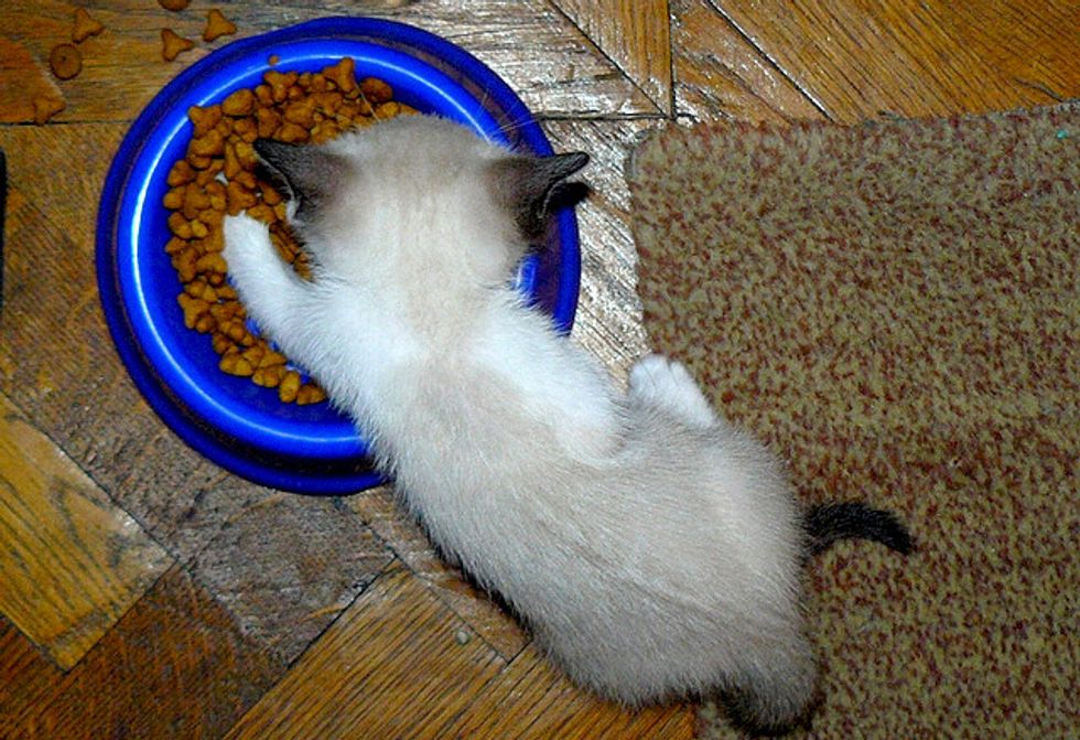 "The very first time I let her walk on the floor in my room as soon as her paw healed, she went straight to Pitsi's food bowl and did what you see... her very first contact with kibble, at 6 weeks."