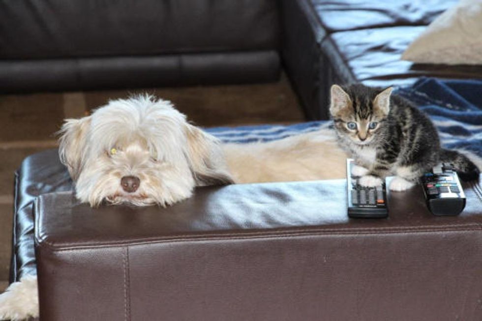 Mika and his TV buddy the dog. Of course, he takes control of the remote and what to watch.