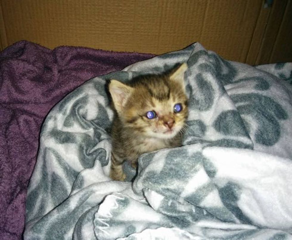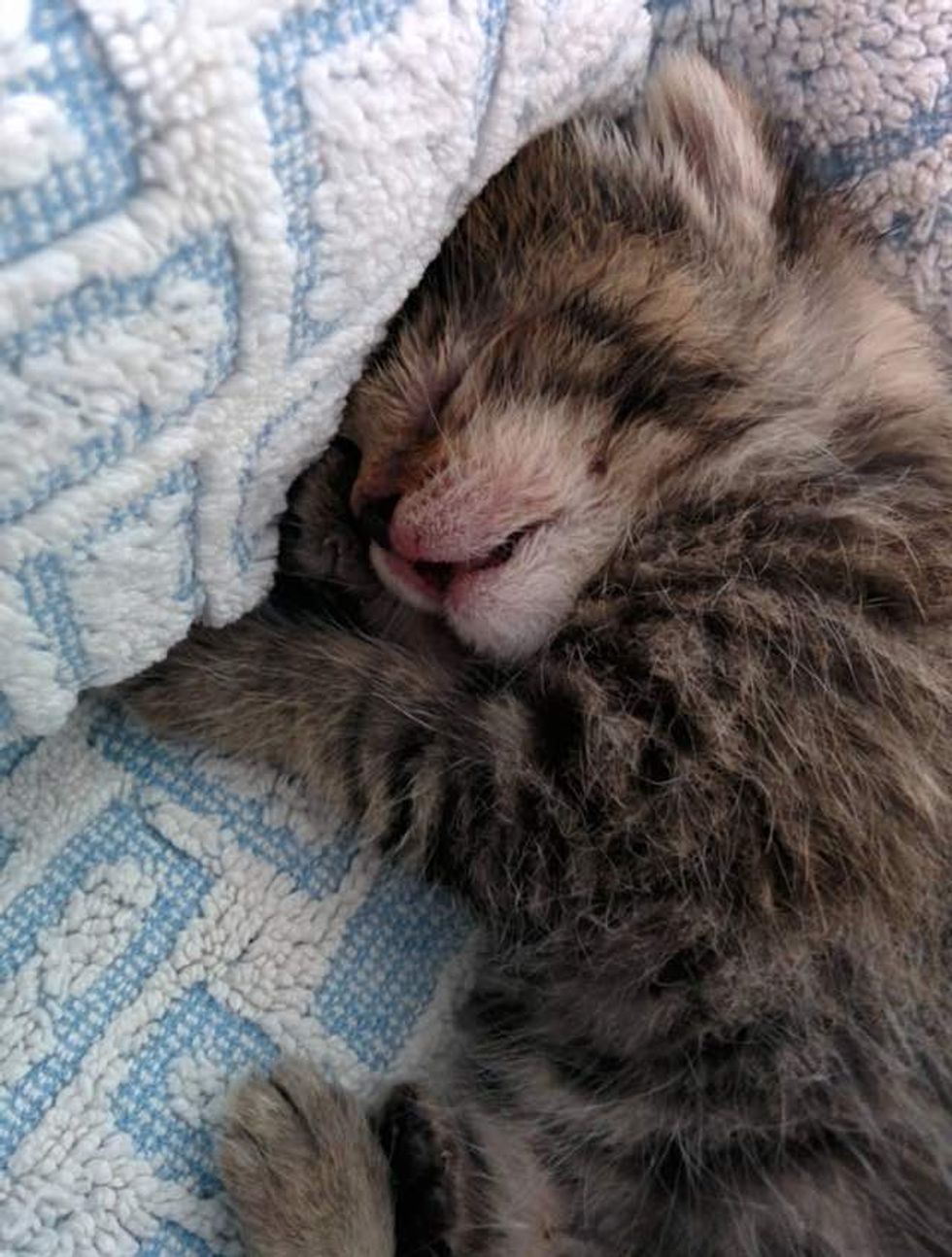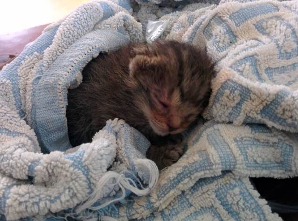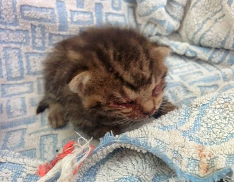 The veterinary clinic was closed on Sunday, so they tried to clean the blood off the kitten's face. "We were worried, first time we found a cat like that… We tried to keep her warm and hydrated with a little syringe of water."