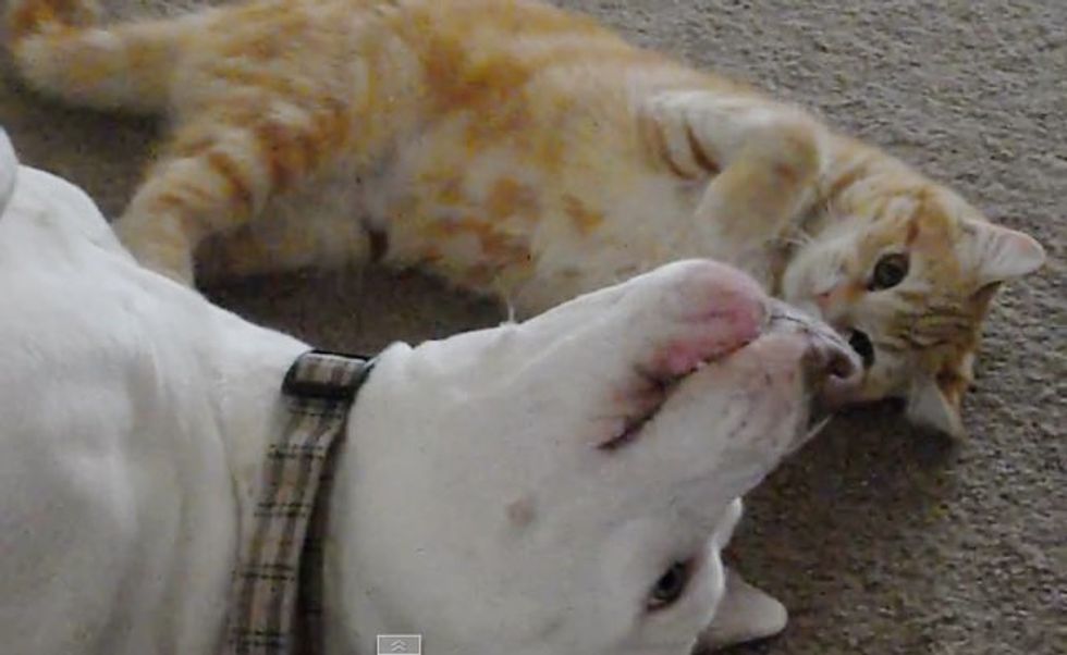 Little ginger kitten meets a gentle dog, then something adorable happens...