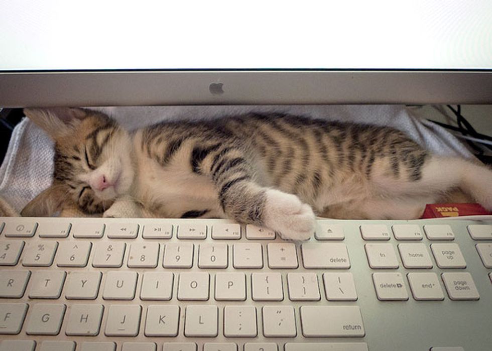 This cute tabby is her mom's little companion. She likes to lie by the keyboard and occasionally offer some help in typing. Work seems so much more relaxing and fun for her mom with her around. She sends purrs to her mom's ears and offers a few head bumps when her mom just needs a break. Aren't cats the sweetest companions?
