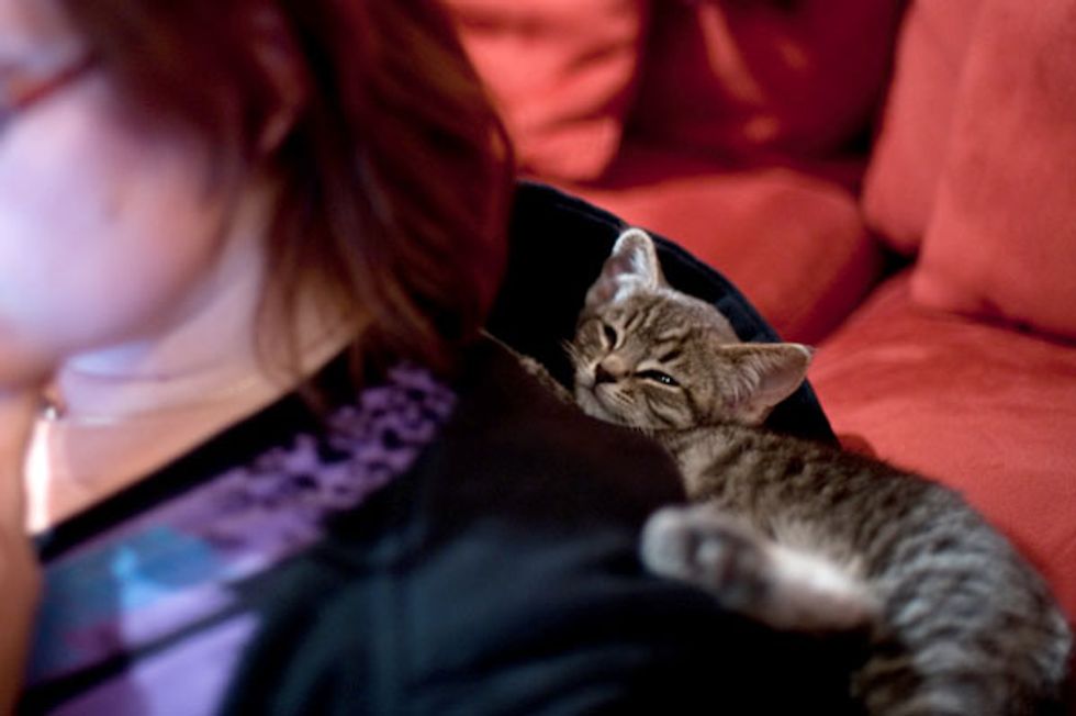 It took a lot of patience, but a week into her foster care, she blossomed and even became a great little lap kitty. Cuddling became her forte and she loves the crack between the arm of the couch and someone's leg. It's a like a hug to her, cozy and snuggly.