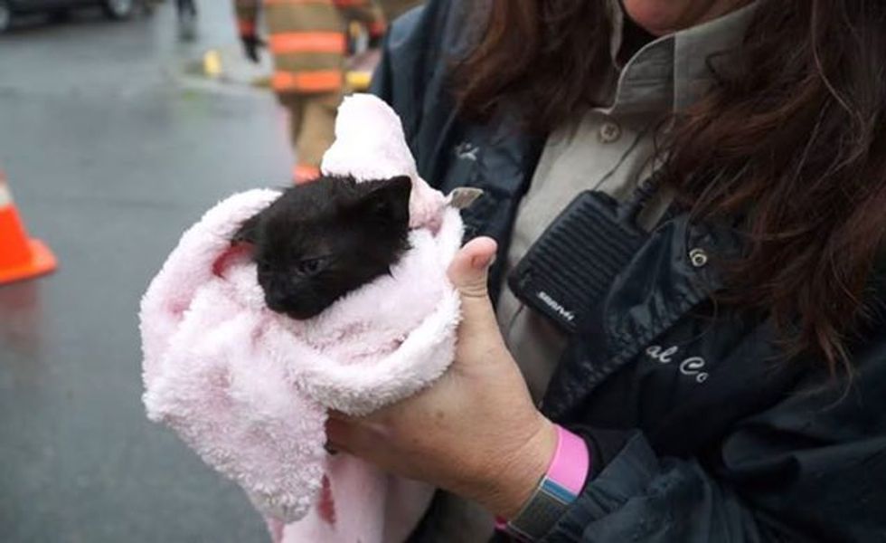 They worked together to coax the kitten out to safety. "Despite the cold and damp – and front paws worn raw from trying to escape the pipe – the cat is in good condition," according to animal control officer Angela Lee.