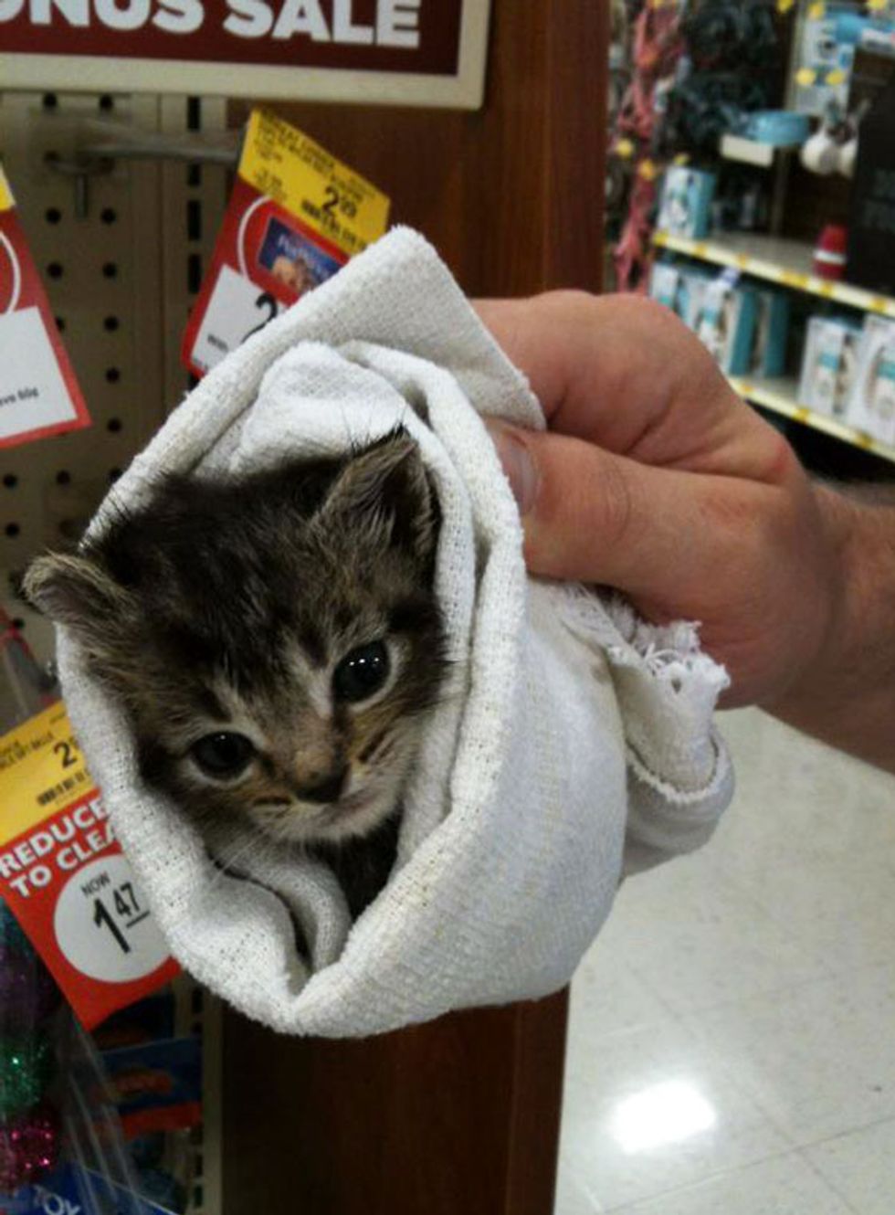 "Burrito kitty from my work.... He's about 3 weeks old now, still has to be bottle fed. Some woman brought him in and said she didn't want him anymore because he had fleas and they were 'jumping on her'. Poor little guy was on his last leg. He's doing quiet well now though," said BirdyBridget via reddit.