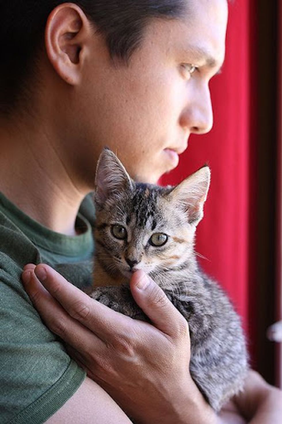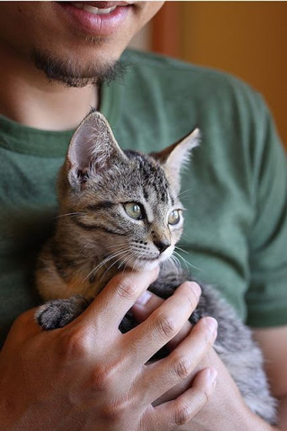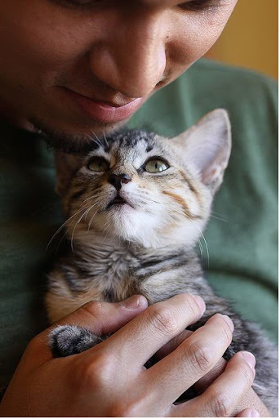 Lola is a 10 week old rescue. My husband and I were at PetCo to buy litter for our two 4 year old cats and a local a rescue group was there for adoption day. We decided "just to look." As soon as my husband held Lola he knew that he couldn't leave her. She was purring the instant he picked her up and climbed up to nuzzle his face.