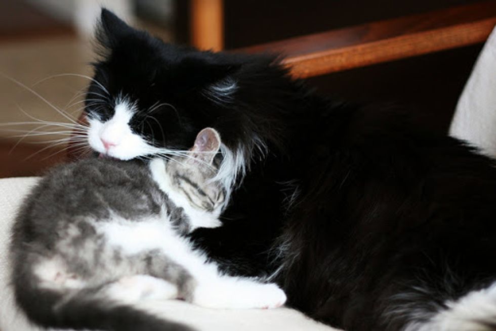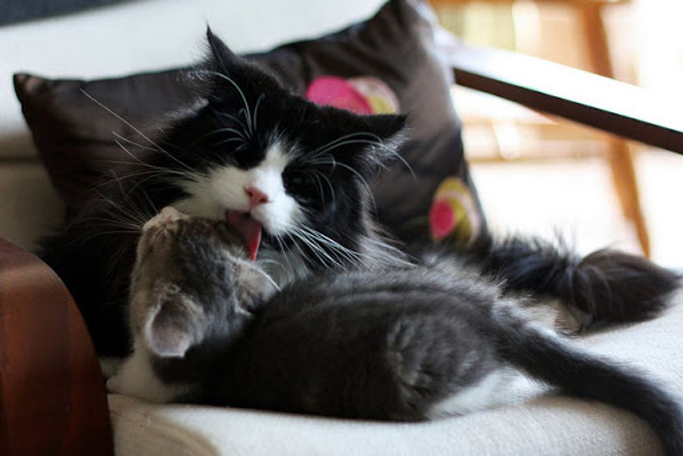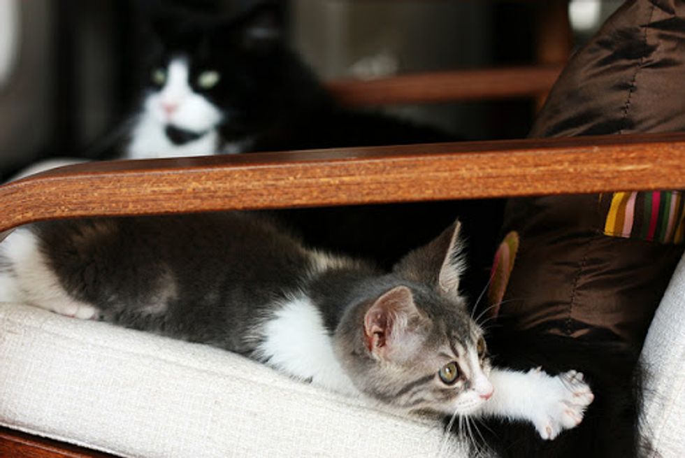 She's a hilarious mix of crazy and snuggly. For the first 6 days that we had her, I never saw her asleep - she spent all her time running around, trying to befriend Olivia and Riggins, our other two cats, and sneezing so hard she knocked herself over (she came to us with a bit of a cold). She's since settled down, and alternates between running around like crazy and flopping onto one of our laps to take a nap. Her favourite toy is a jingly mouse on an elastic attached to the closet doorknob. And while she's having a harder time winning over Olivia, as you can see from the pictures she and Riggins are best friends.