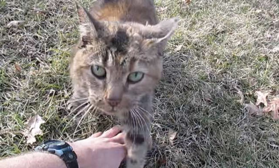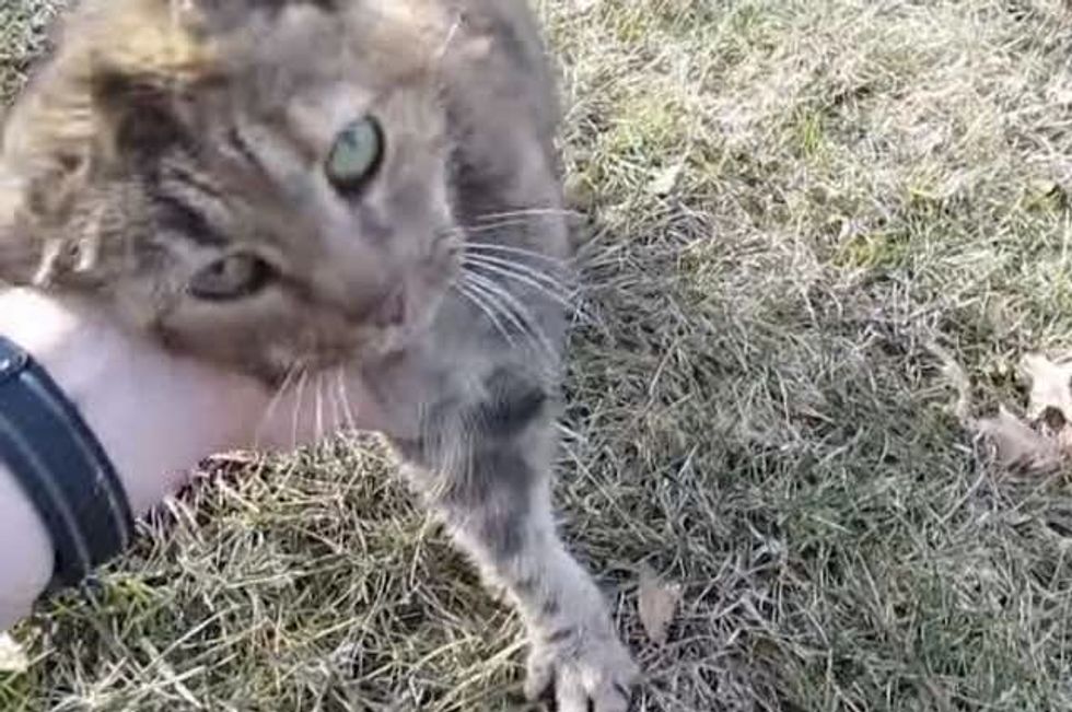A very friendly stray cat crossed paths with a man out in the country. She begged for attention and love and wouldn't let him go without her.