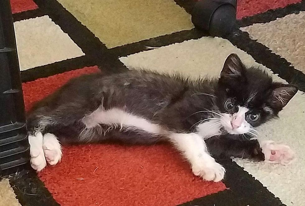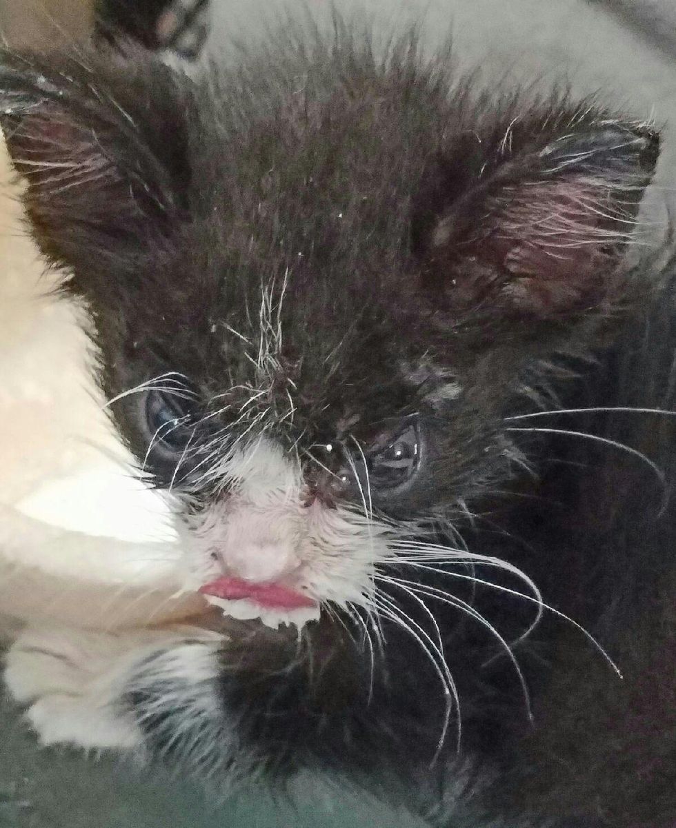 They gave the kitten food, cleaned him up and got him started on his recovery from an upper respiratory infection.