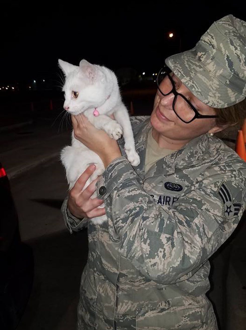 When an airman returned to the base from a lunch run and saw the little fluffy guest asking everyone for attention, she stopped and noticed her pink collar. She knew right away that the kitty must have been displaced and offered to help her get home.