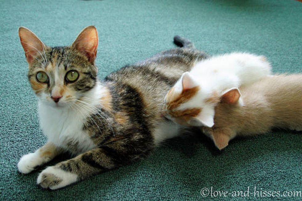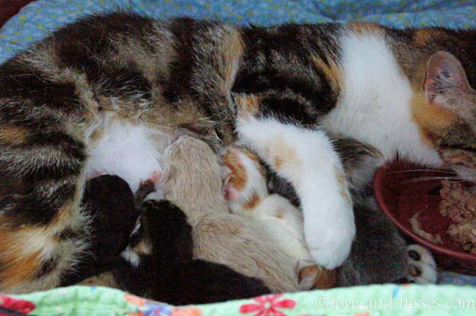 Here mama is re-fueling herself while feeding her very hungry kittens.
