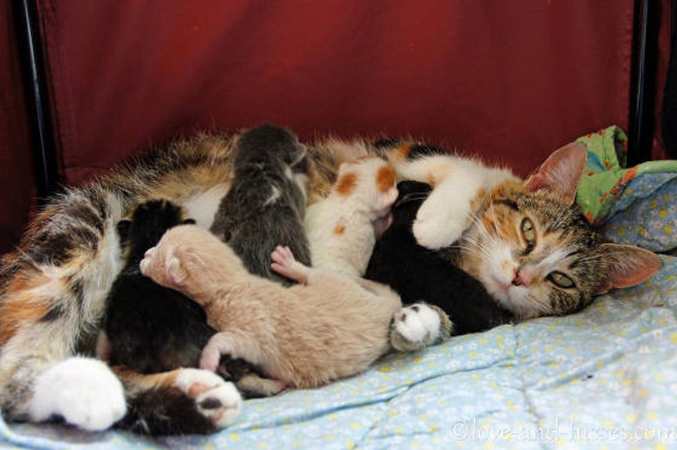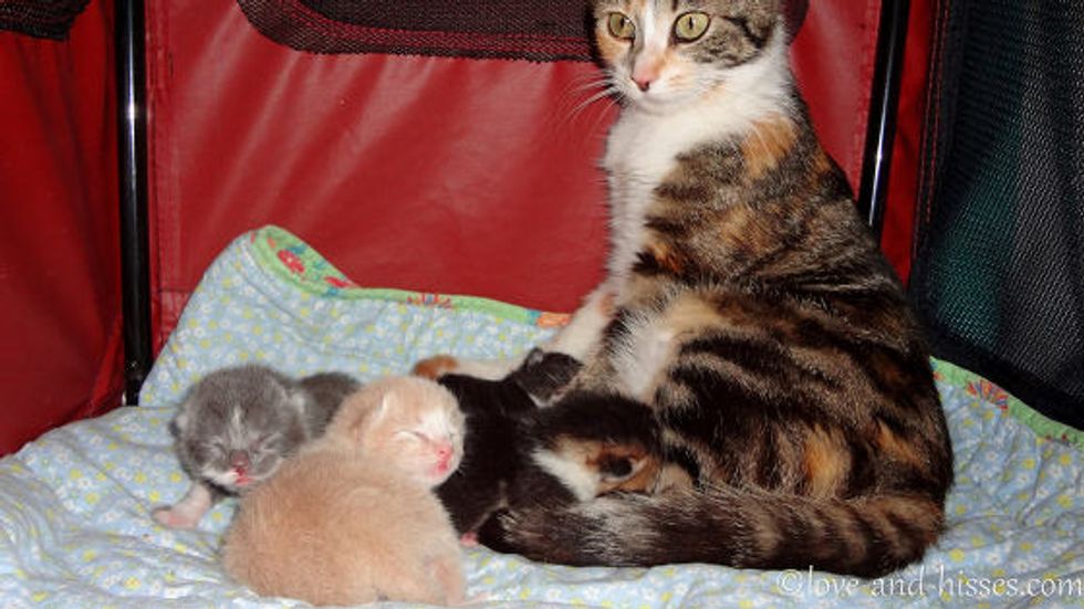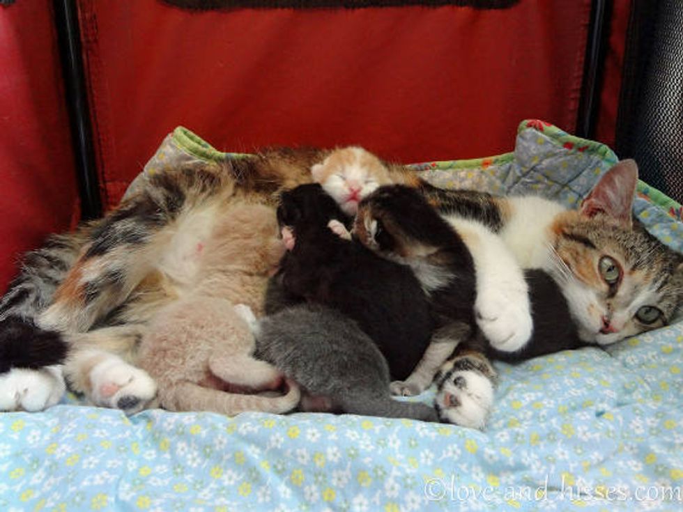 Robyn Anderson shared the story with Love Meow: "On April 13, 2013, Khaleesi came to us; she'd shown up at a family’s house, and the vet told them that she was pregnant. They fell in love with her and wanted to keep her, but the other family pets weren’t having it so she came to us.