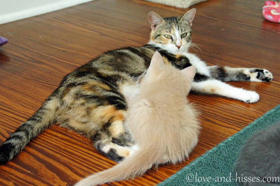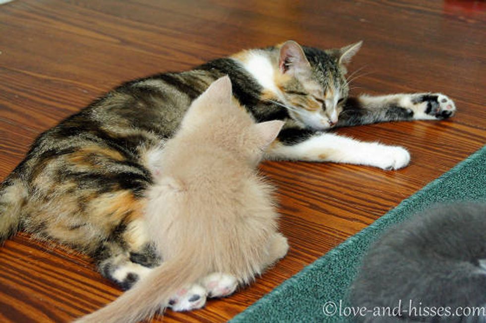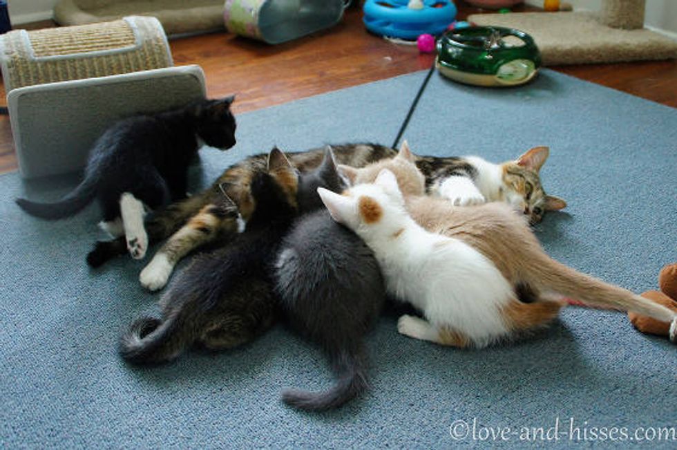 Even during a brief break, the kittens continued nursing. There was really no time to rest for the busy mama.