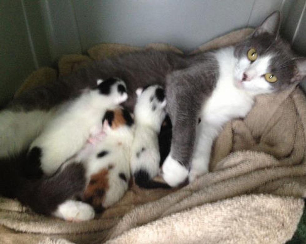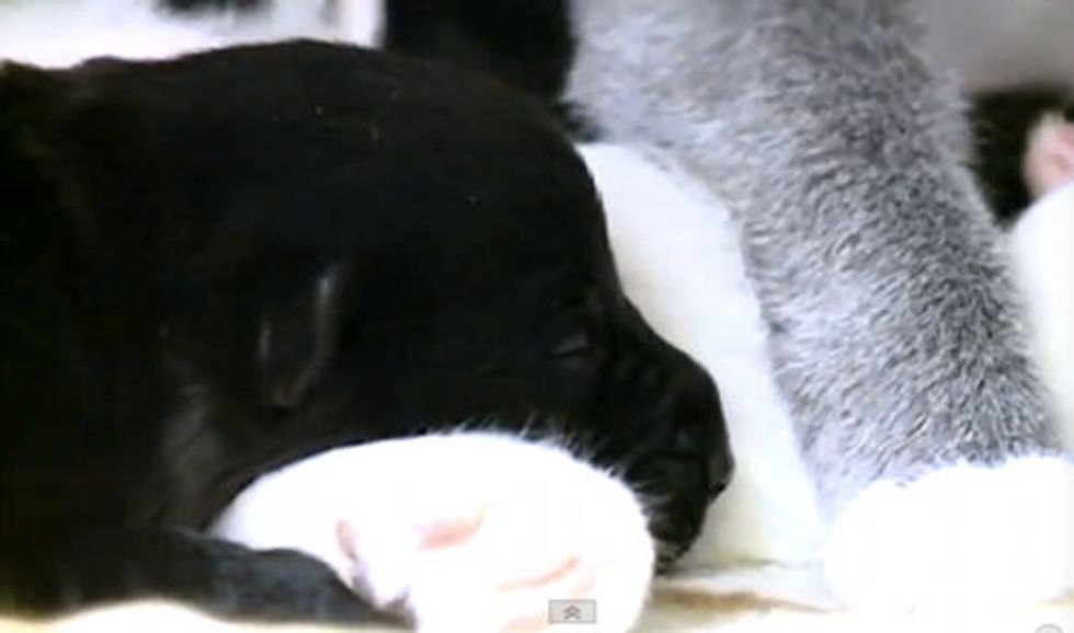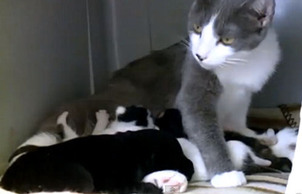 A rescue mom cat with a litter of 4 kittens of her own nurses a tiny border collie puppy who was rejected by her own mother at the Animal Rescue Fund of Mississippi. When the volunteer handed the mom cat the orphan puppy who desperately needed motherly love, she took her in and started letting her latch on her.