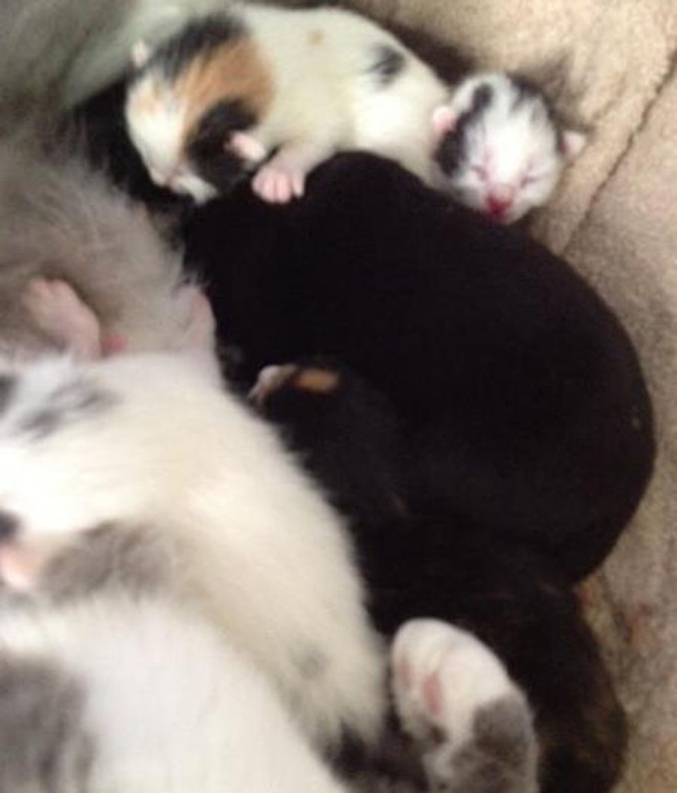 Snuggling with the kittens, the puppy now has a purry family that loves her.