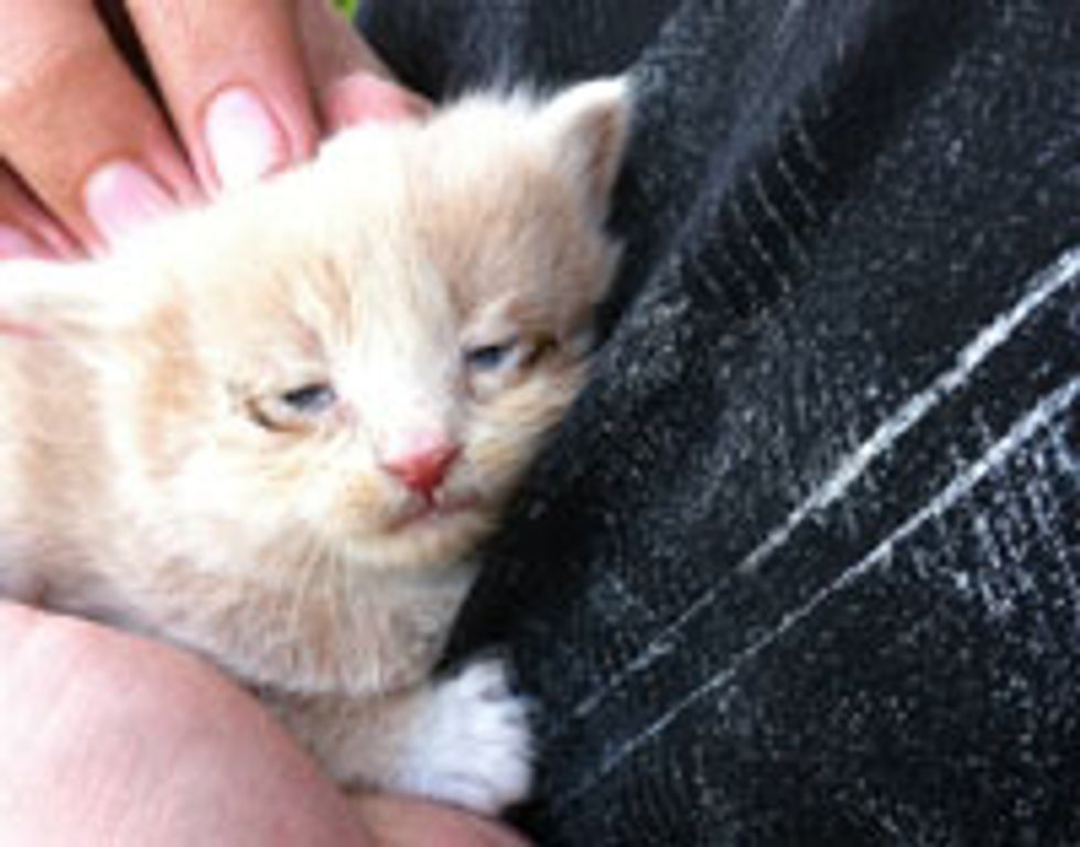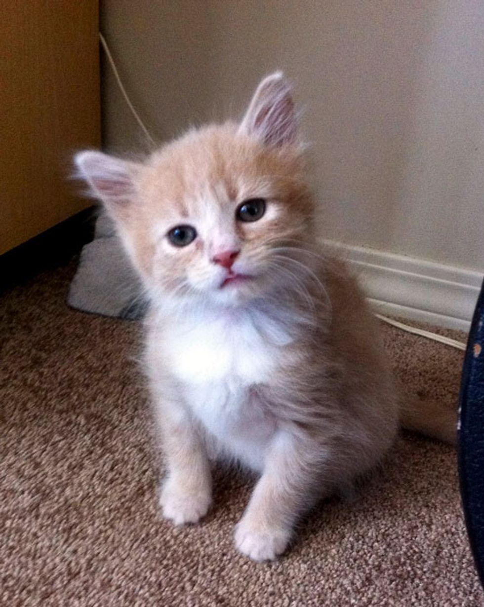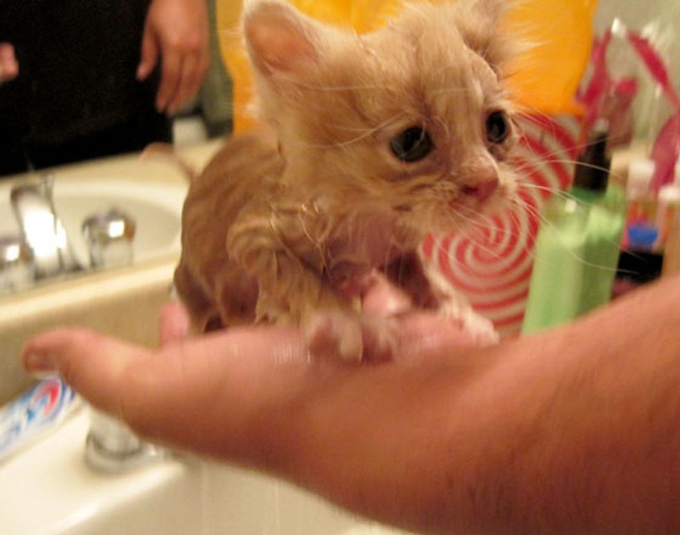 "After I brought him inside and made sure my other cat Fedor was locked upstairs (Initially all cats are territorial and might attack) I cleaned him up and made up the spare bedroom into a play pen. I googled as much information as I could about caring for new borns and took him to an emergency vet hospital. Found out he was near moments from death, devastatingly dehydrated and probably going to be blind from a horrible sinus infection that was halting the development of his eyes. After I was cleared to take him home I got all the necessary tools for being a momma cat, and did my best. Waking up every 3 hours to feed him, training him to eat, then instigating bowel movements (at that age they are too young and weak to use the bathroom on their own, especially since this one was abandoned) it was an incredible learning experience and created such a bond with him. Even now in the older pictures you can see a bit of discoloration and "gunk" around his nose, his body never finished developing and the infection caused some complications so his nose never stops leaking, it's like a 24/7 runny nose, it's weird, but funny to watch because he never stops licking his nose and mouth."