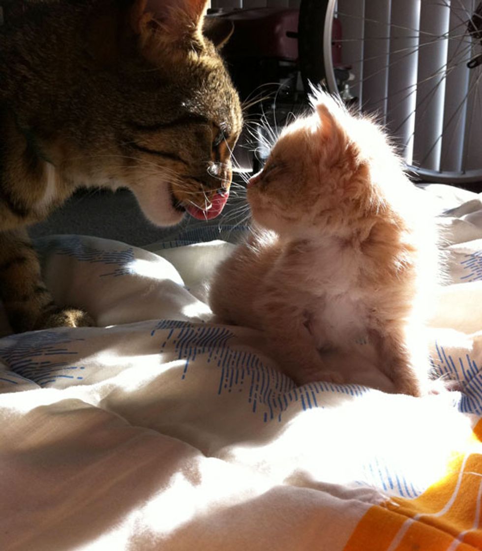 "The first photo taken he was about 1 and a half weeks old, he is now 9 months and larger than our original cat, who is 2 years old. Our original cat Fedor has been an amazing help in teaching lucky how to be a cat, and it was an amazing journey for me to be able to save this beautiful cat's life," kitty's dad added.