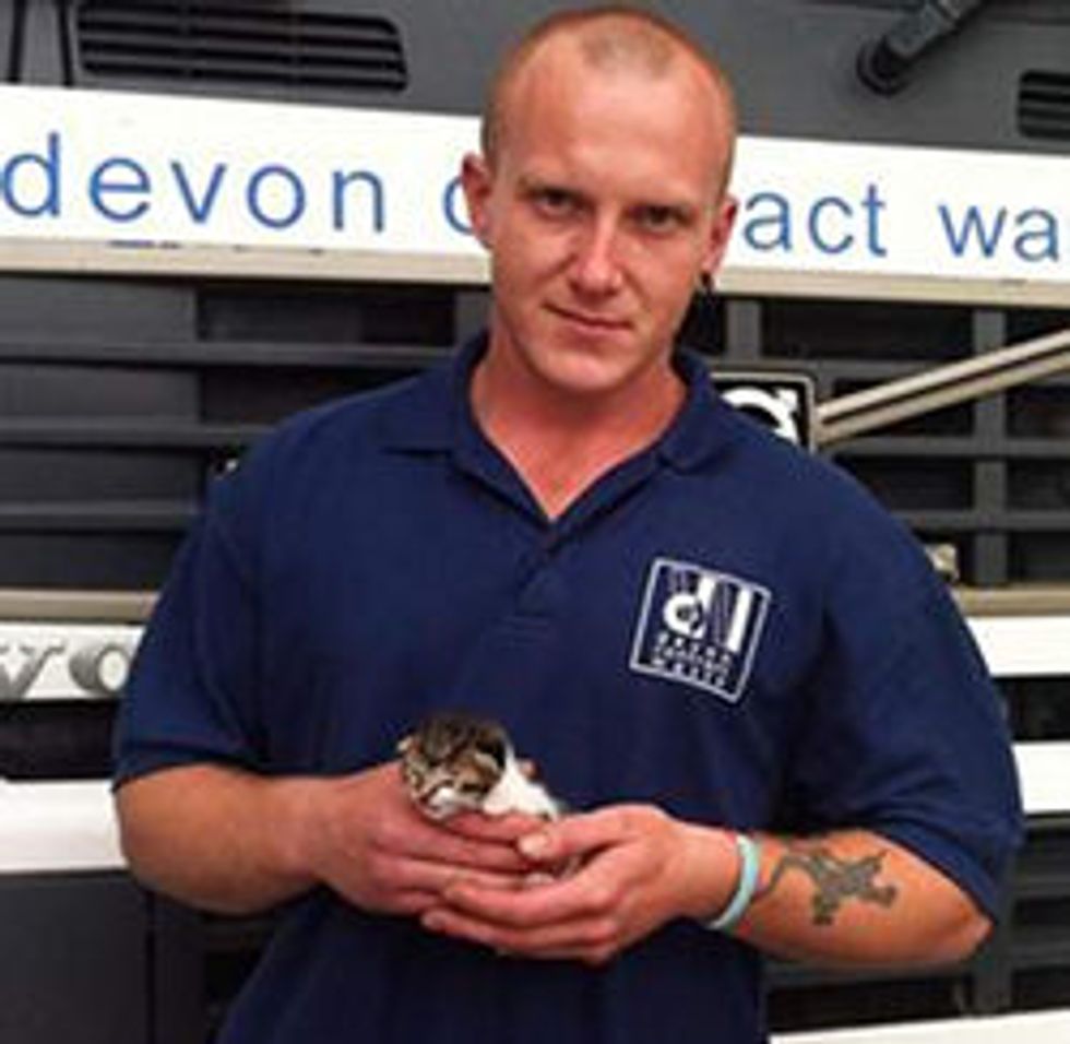 Lucky the kitty was saved from being crushed in a recycling truck by two workers from Devon Contract Waste who heard her cries and stopped the machine in the nick of time.