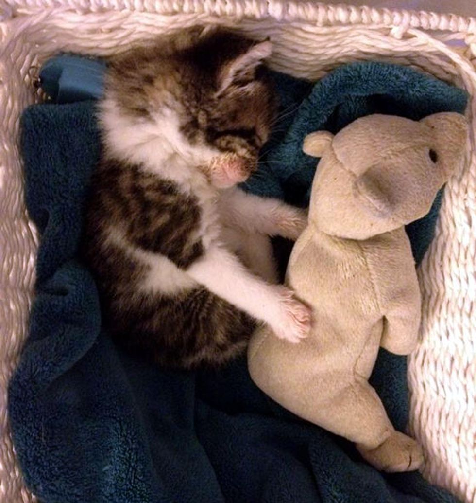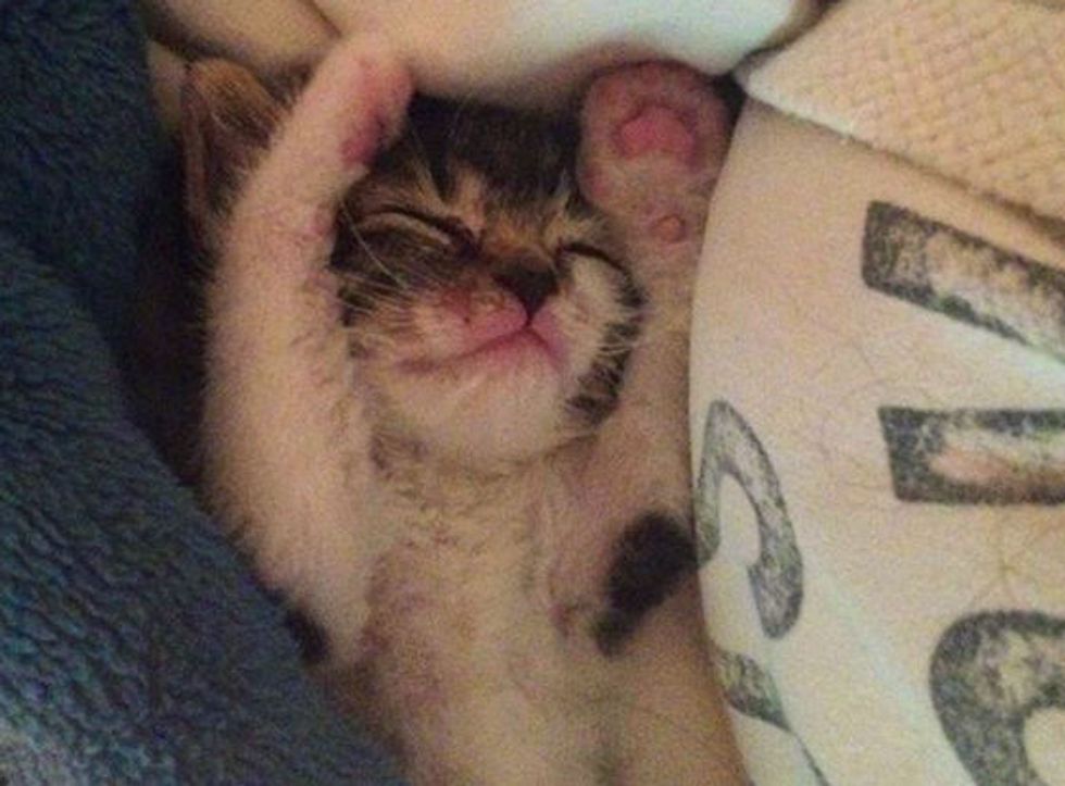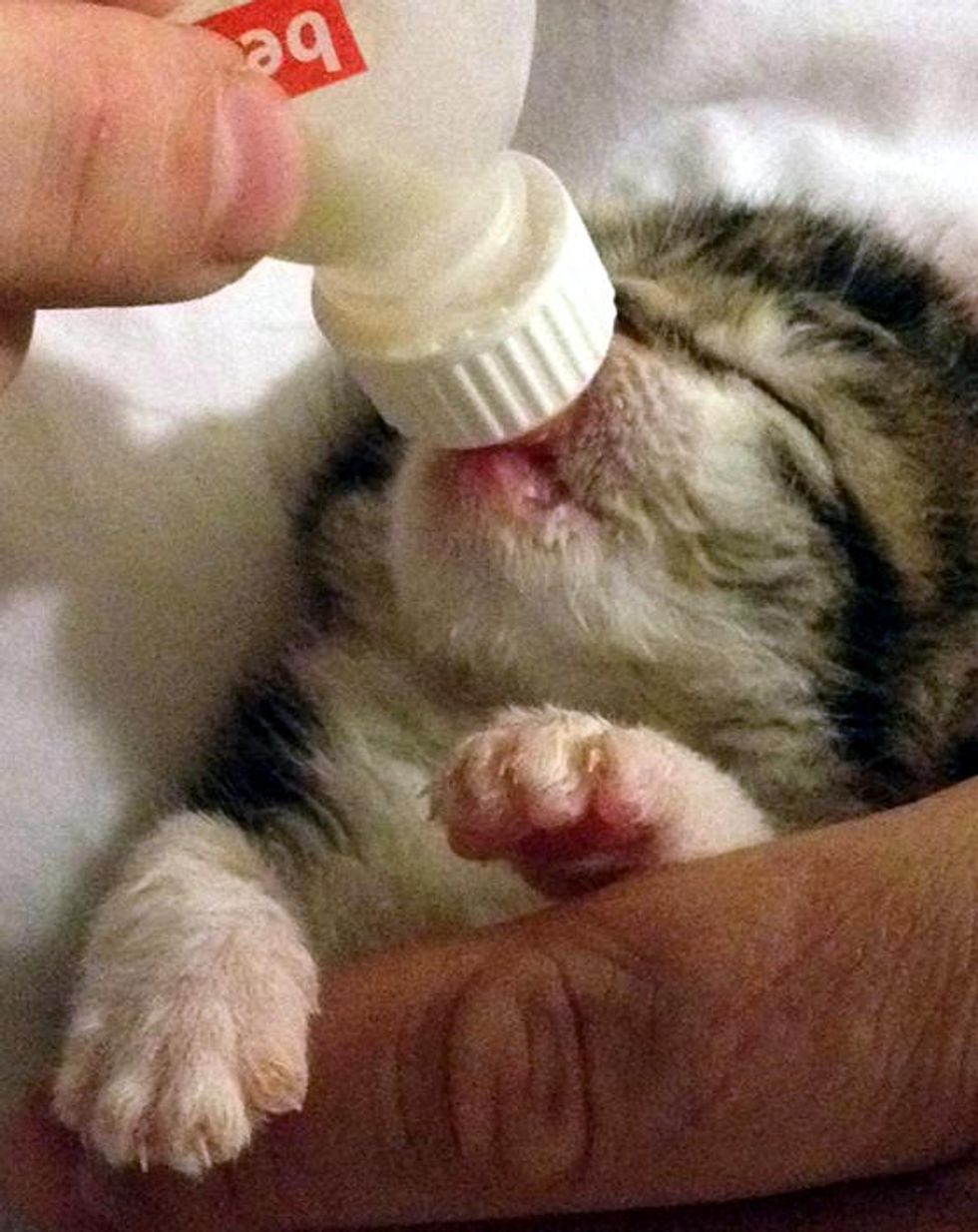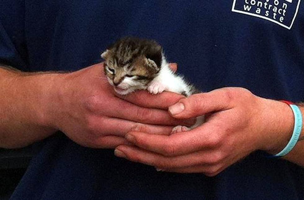 One of the workers saw the kitten fall from the crusher's blades and immediately picked her up and brought her back to their office.