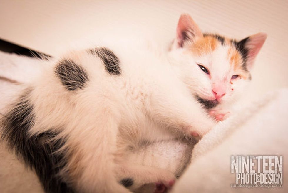 "We rescued Lucky from living as a stray in the gutter… Originally we thought her eye had just been scratched but the vet believes it was an early viral infection that spread to her eye before her eyes opened…," said Kaitlyn V.