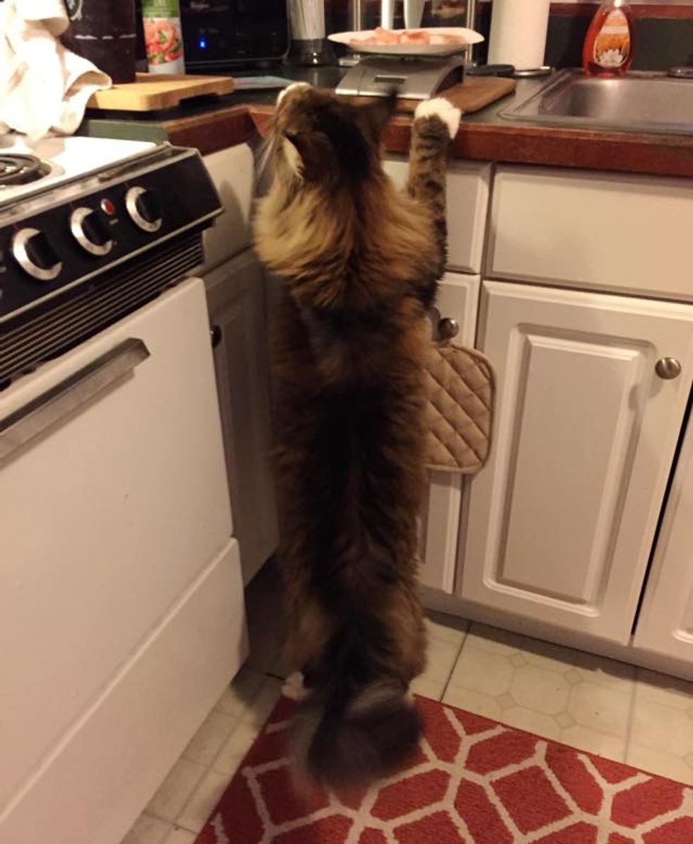 He's very fluffy and long. When he stands up, he can reach the counter with no problem at all.