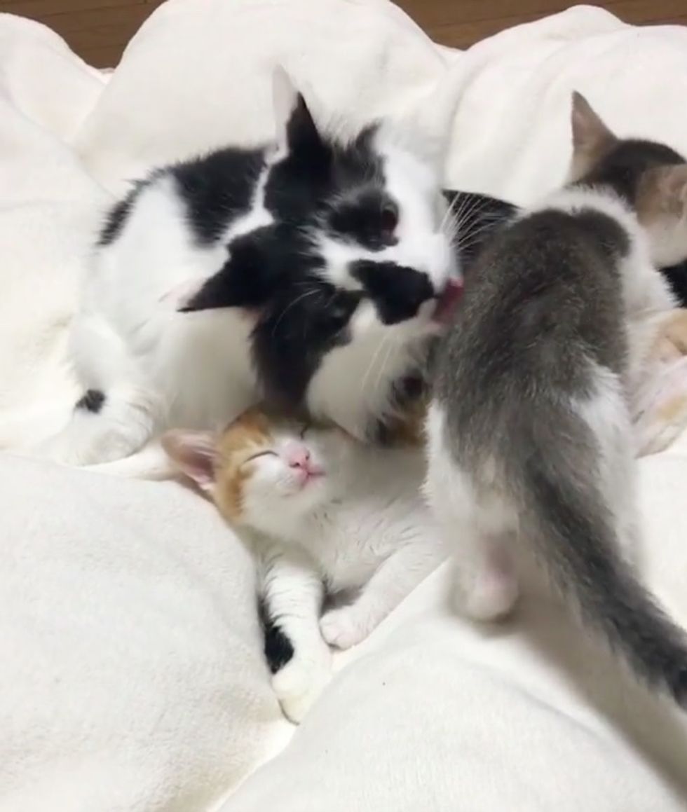 The older cat started grooming the kittens several times a day, and even carried them like a cat mother would from one spot to another for more cuddles and bath time.