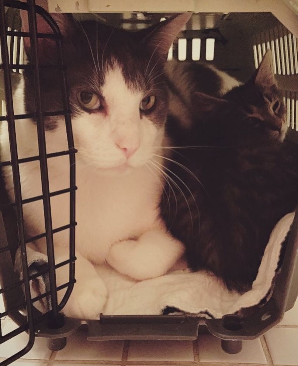 Boing was very shy and refused to come out of the carrier when he arrived, but Charlie came to him and claimed him as his baby.