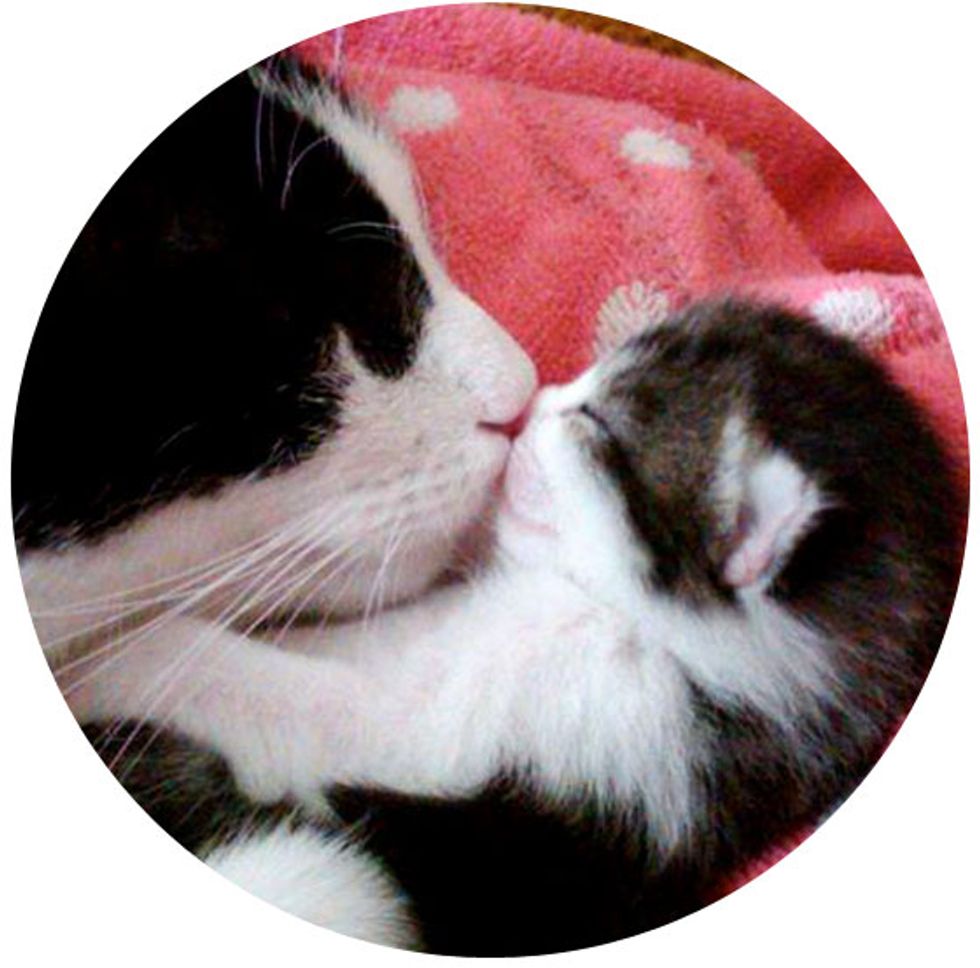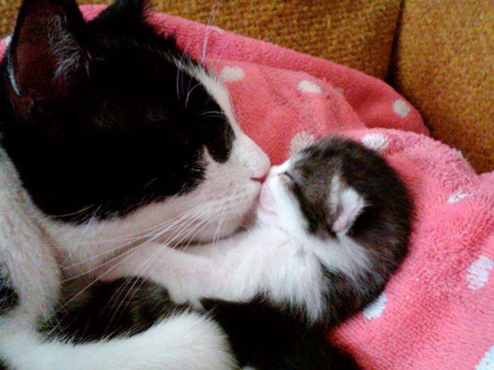 After nursing, little kitten has got a full belly and cat mama comes to clean him up and gets him ready for a nap. Before it's time to catch some z's, cat mama gently gives her little precious kitten a kiss good night. Isn't it a cavity inducing moment?