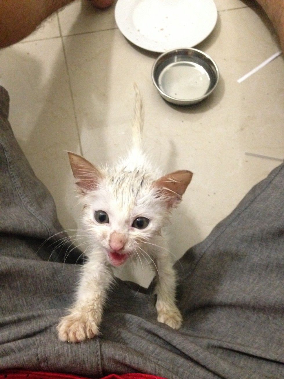 "We adopted this little guy after some coworkers found him in a trashcan. He was super dirty and EXTREMELY malnourished weighing under half a pound at 4-5 weeks old," reddit user aswog said.