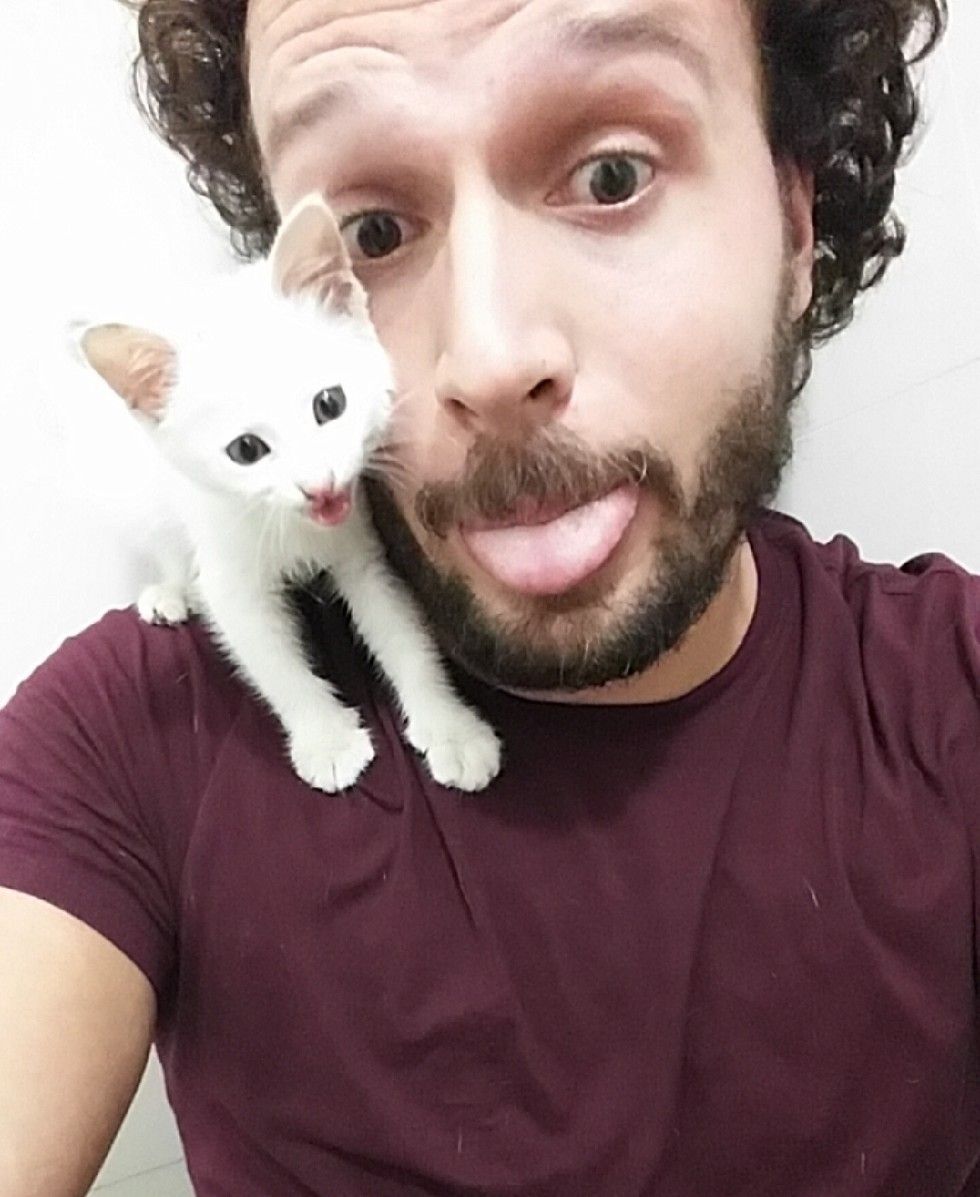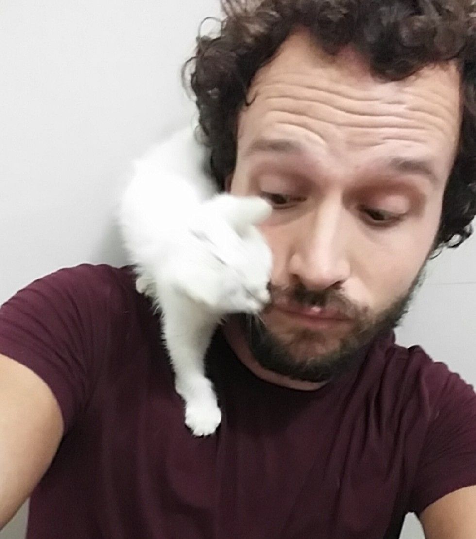 After he brought the kitten home, the tiny fur ball claimed his shoulder as if he was saying "you are my human now!"
