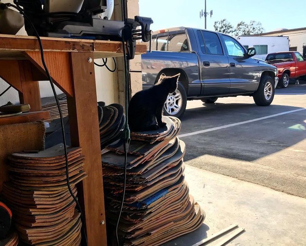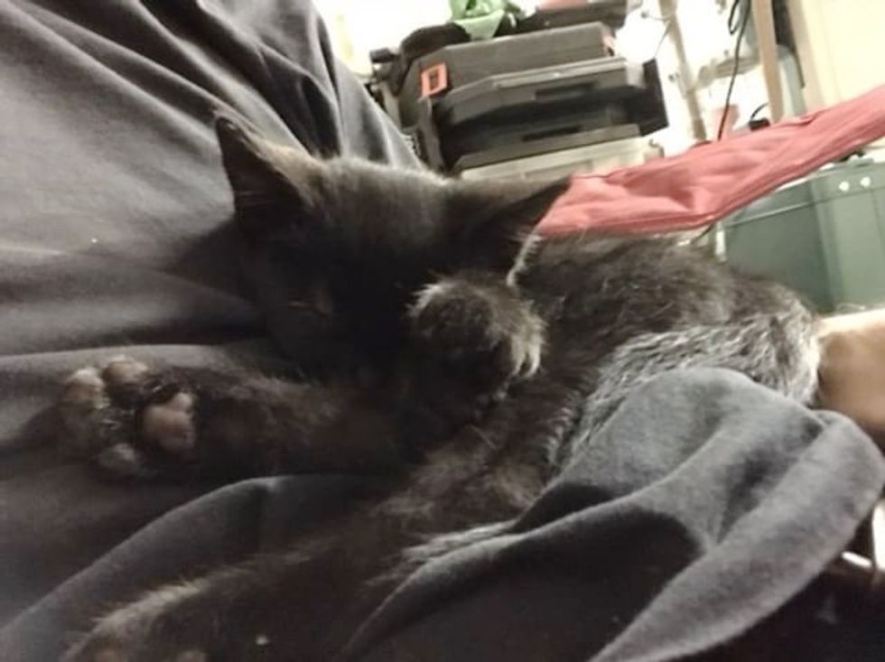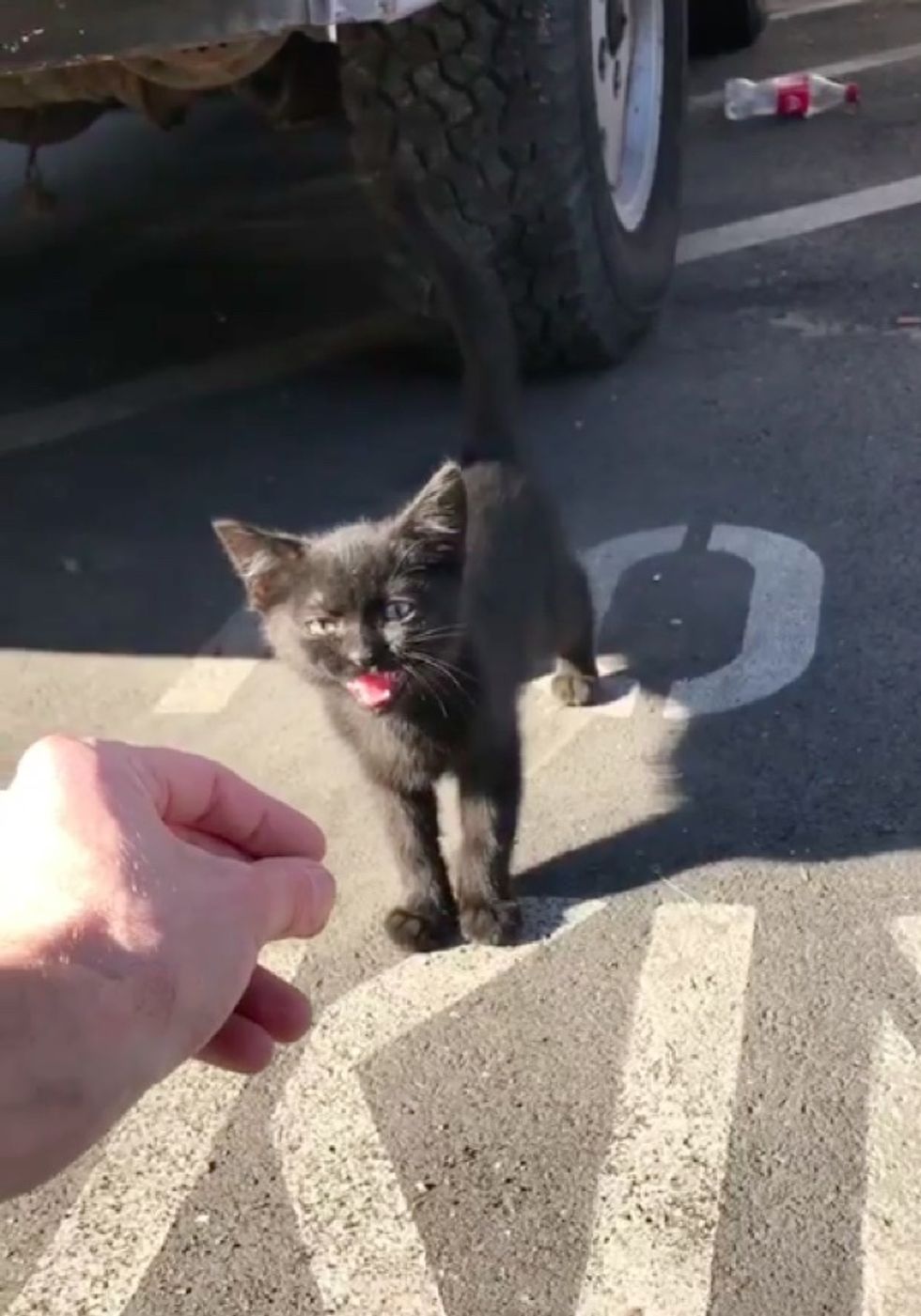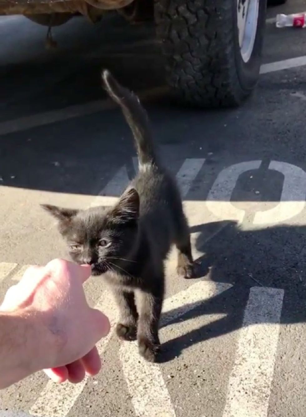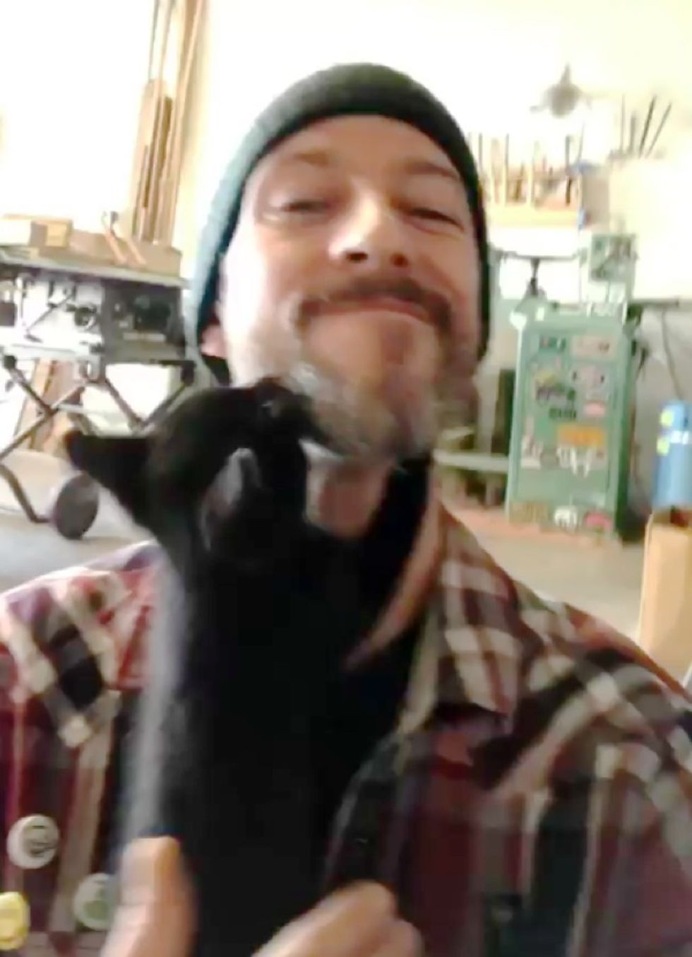 A man found a tiny black kitten near his woodshop in Long Beach, California. Immediately, the kitten took a liking to the guy and walked right up to him, meowing for love and some snuggles.