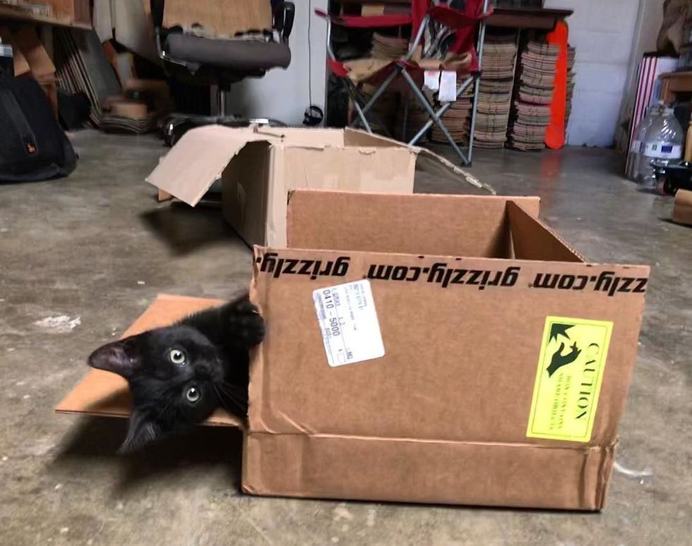 Grizzly chose Justin to be his forever human, and he is now their very own little woodshop cat.
