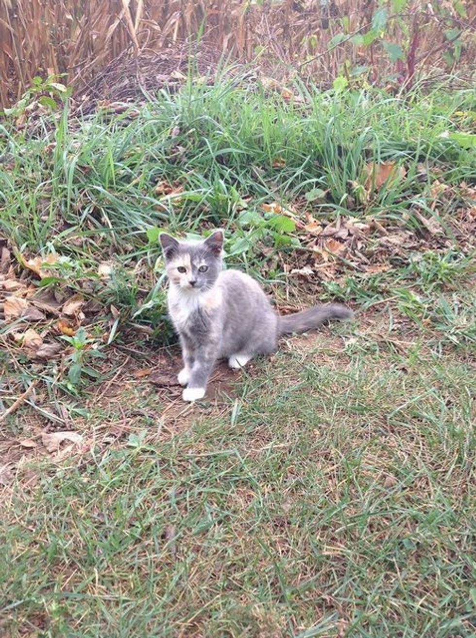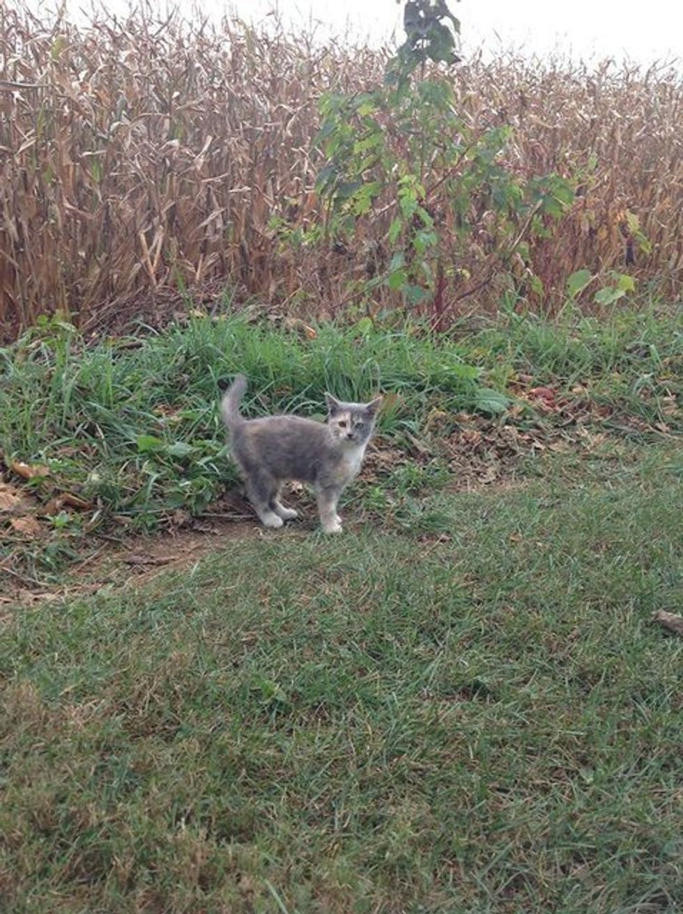 Reddit user NebulonsStyle found a little calico kitty hanging around in a cornfield.