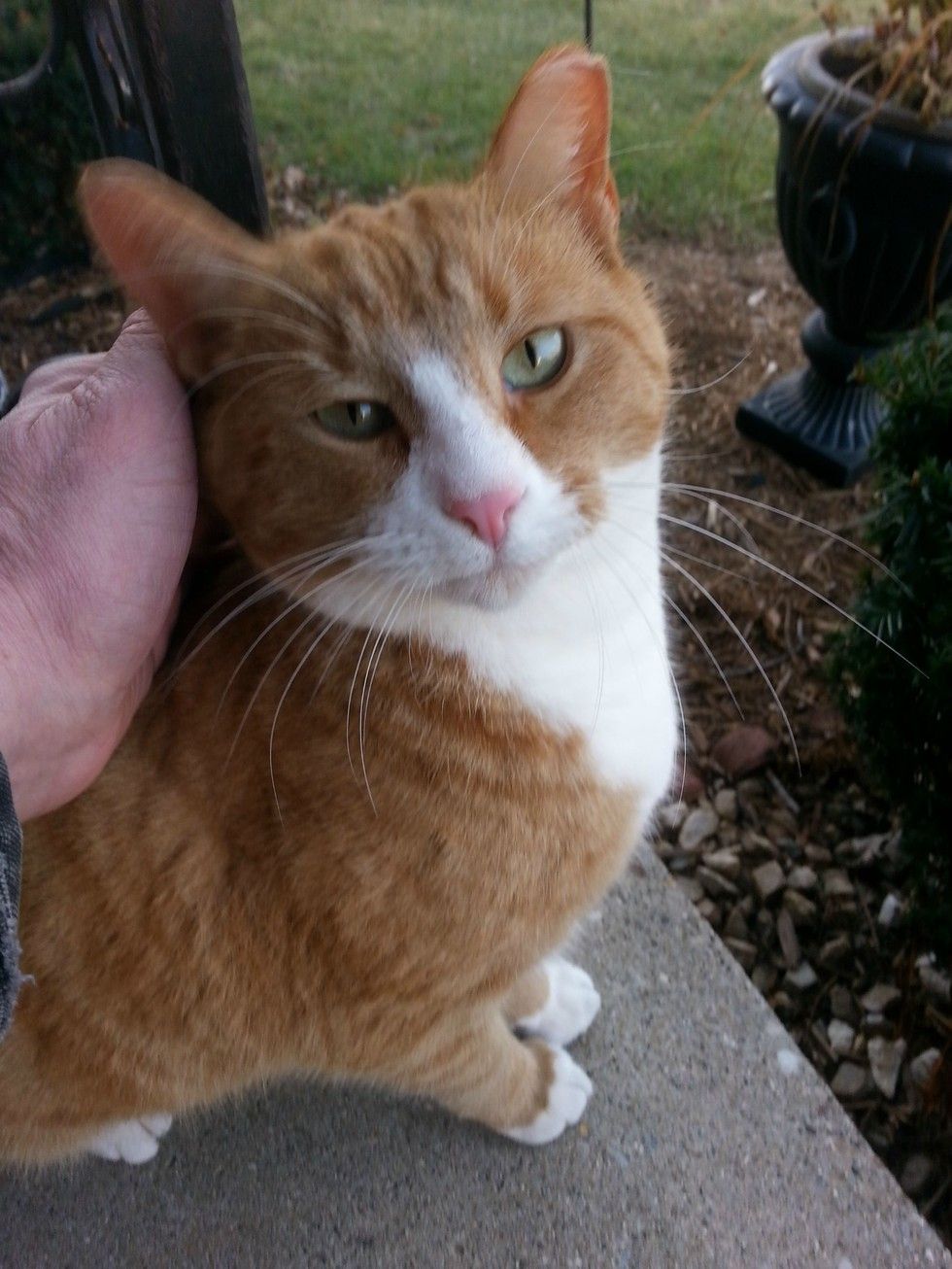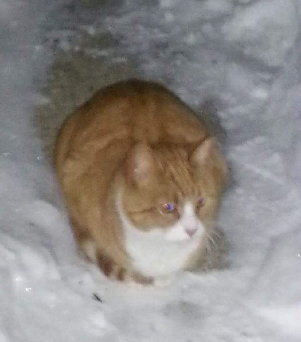A man met a very shy ginger cat in the snow and gave him food and built him a shelter. The kitty came back to him every day. Years later, he let the man pet him for the first time, and the kitty was hooked.