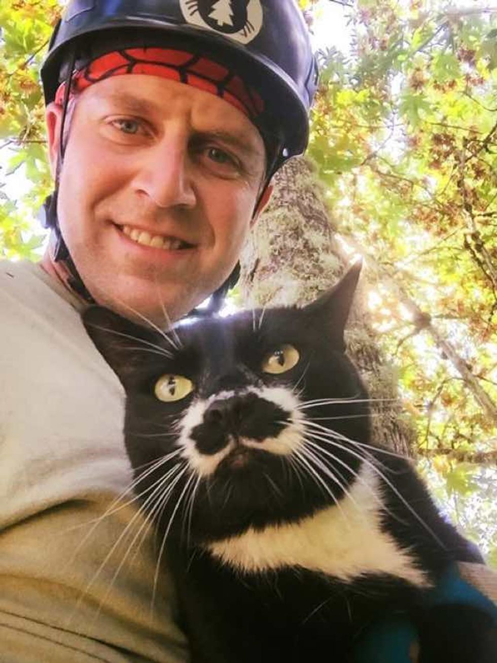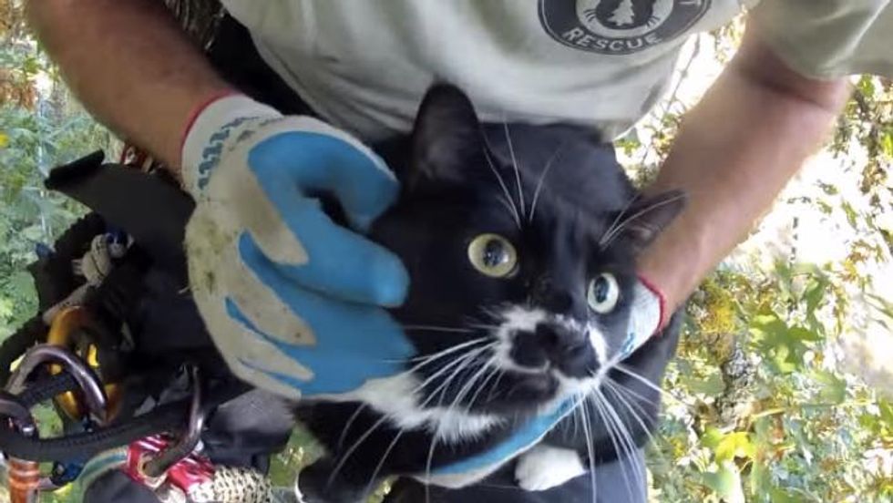 This man climbed a large maple tree to rescue a tuxedo cat who had been stuck there for days.