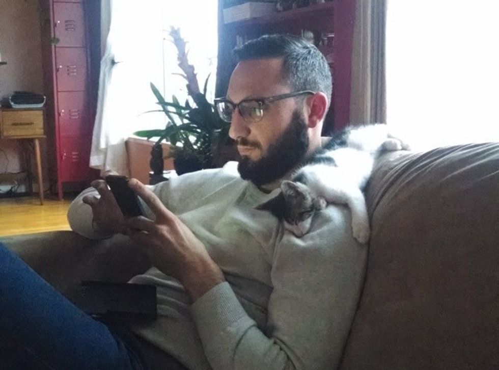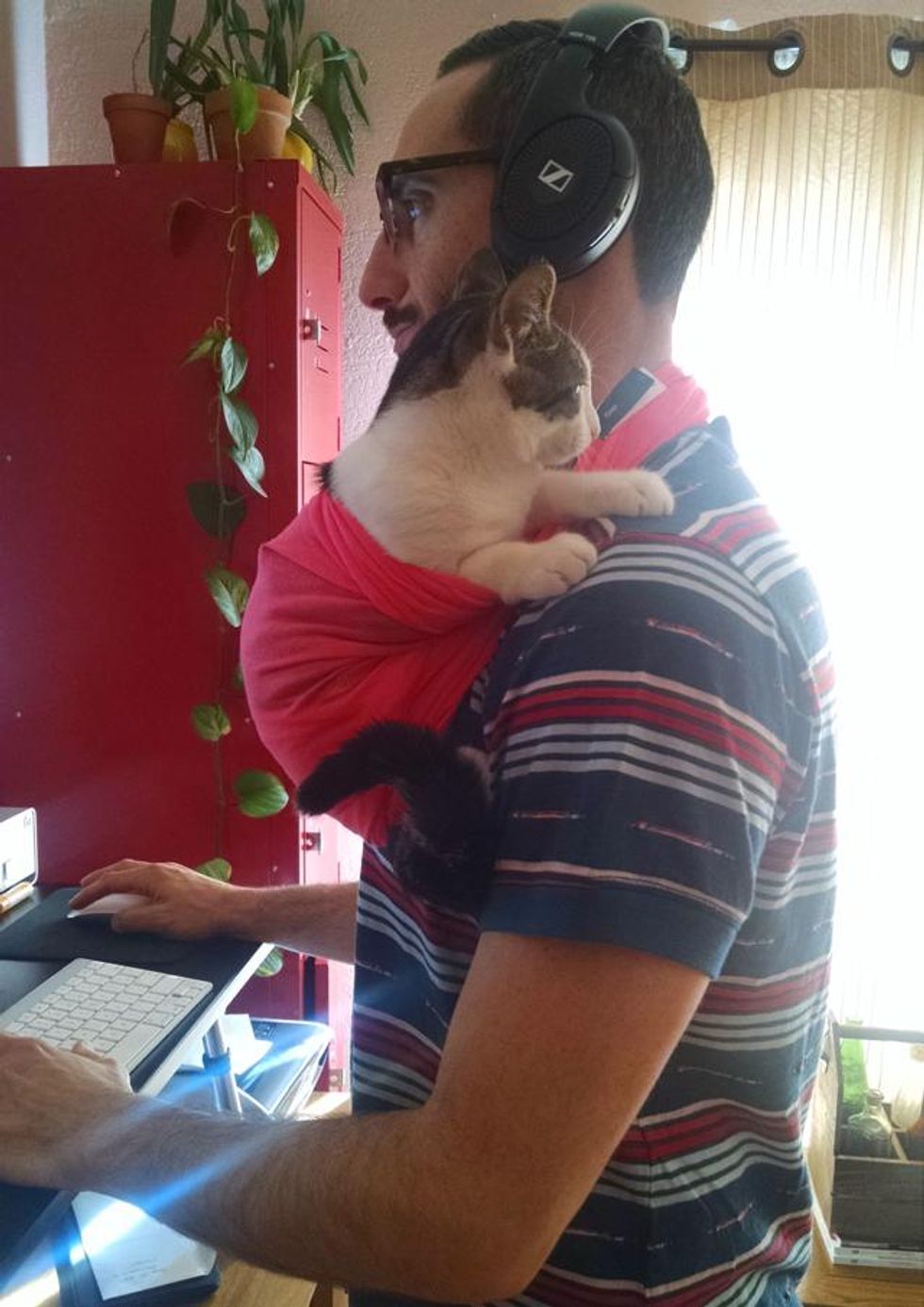 "My boyfriend Cliff works from home, but our kitten Simon insists on being held multiple times throughout the day. This was impacting Cliff's ability to get work done so we had to fashion a kitten sling so that Simon could get his snuggles in and Cliff could work," said Colleen via reddit.