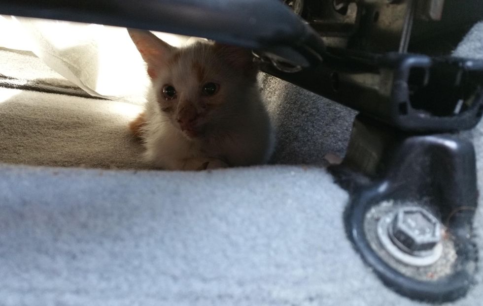 The little stray took refuge in the front-left wheel of the car after it was pulled over. When the man approached him, the kitten looked up at him with those eyes full of fears . The man carefully freed the scaredy little guy and got him into his car. The kitten immediately went under the passenger seat to hide.