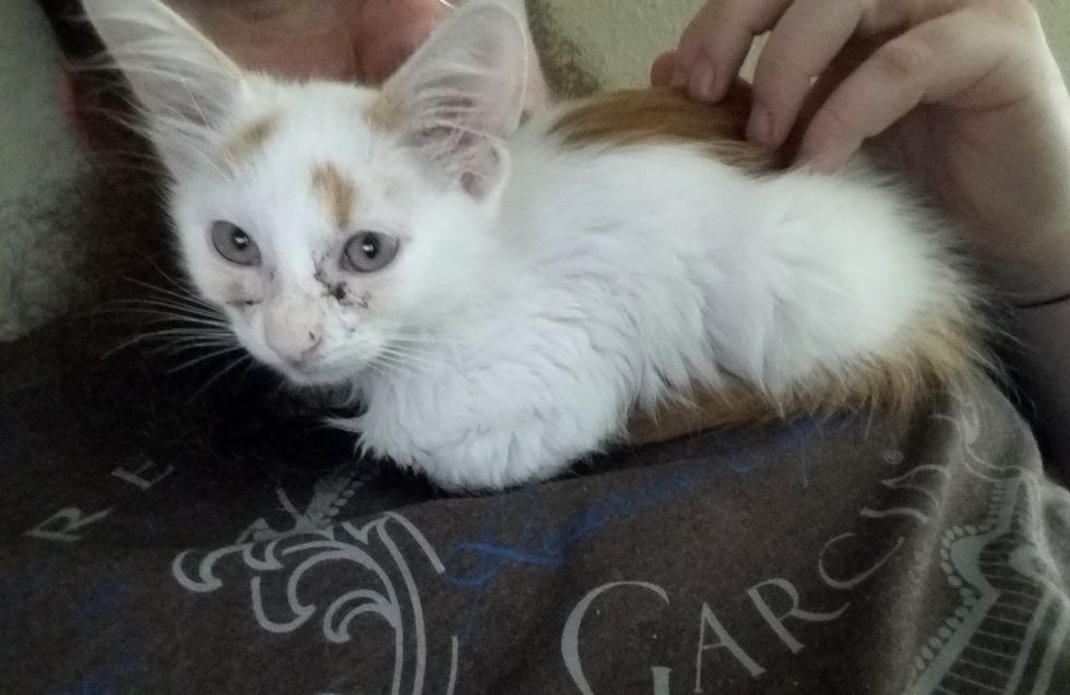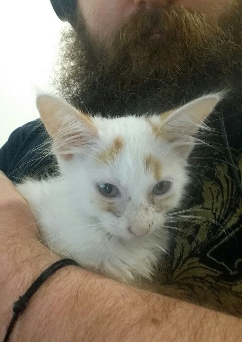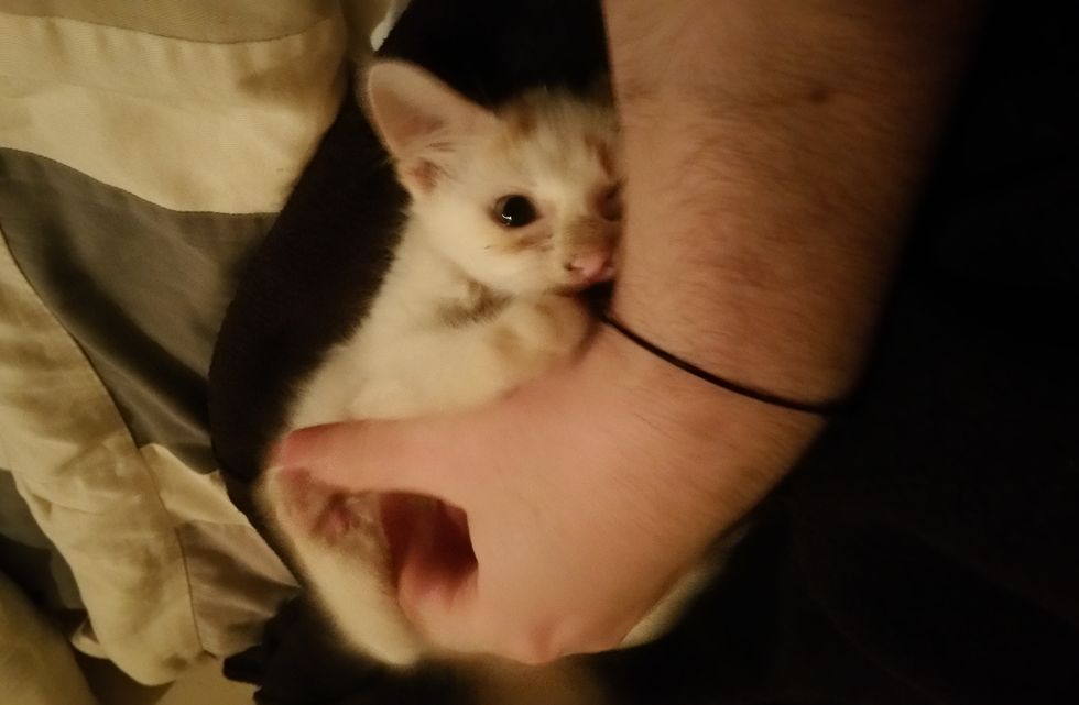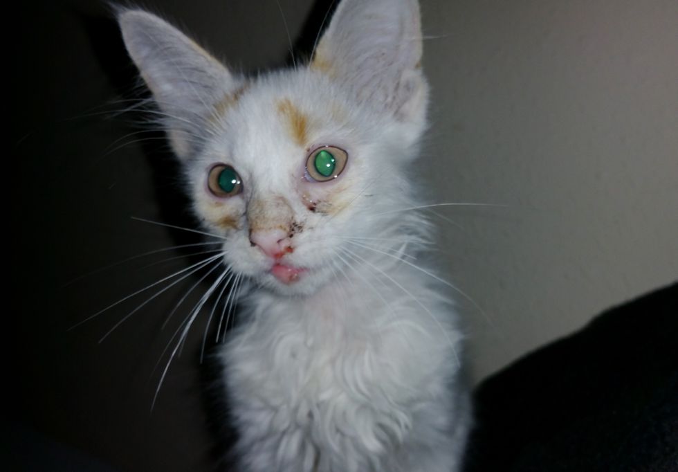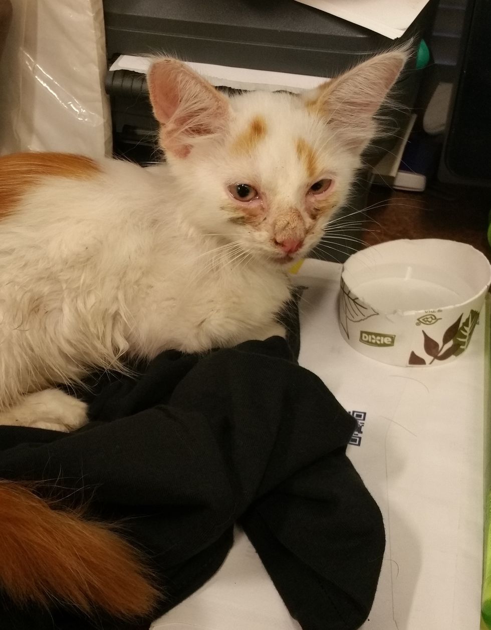 The next day, he took the kitten to his first trip to the vet and got a clean bill of health. "The eye crusts are some combination of dried food, dirt, and possible scratches from prior tussles with other kitties."