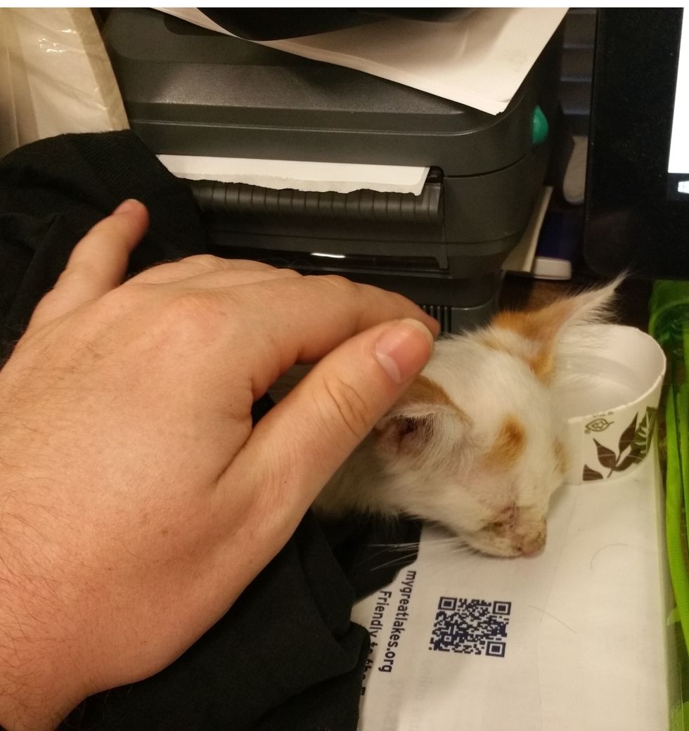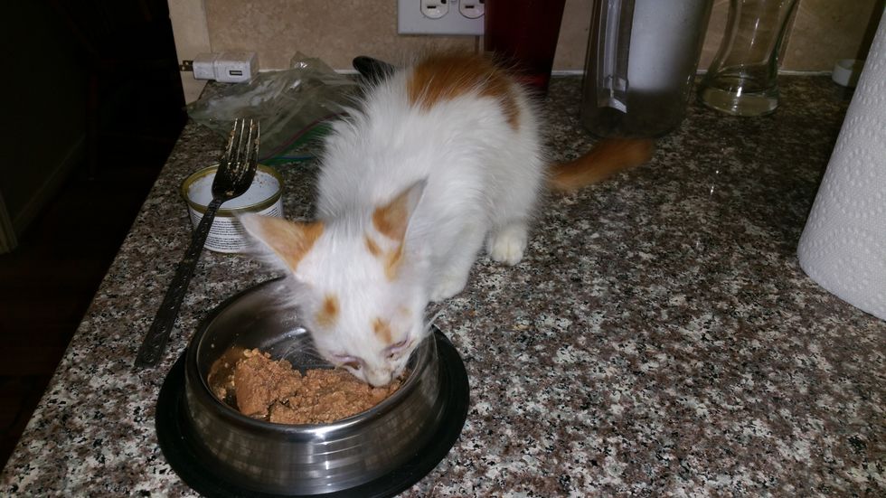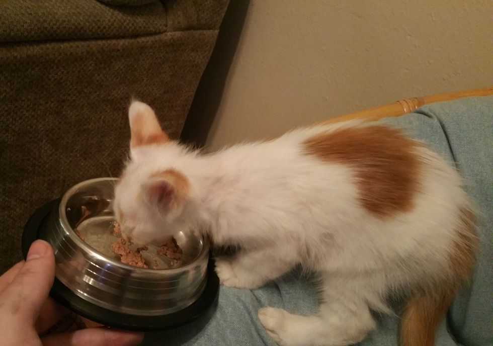 But there's nothing a can of kitten food couldn't fix. "He's figured out what the sound of a can opening means. Started him off on half a can of food twice per day, and now we're up to a full can twice per day."