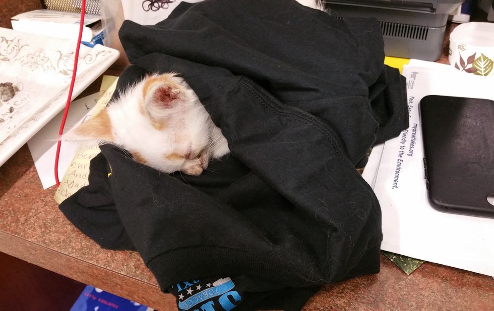 For the first time in a long while, he got a full belly. The little kitten found a warm place to snuggle in for a nap.