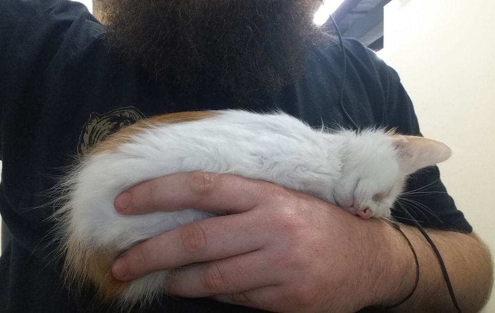 Now the kitten will fall asleep in his arms while he is holding him, and hog his chest for hours. The little guy knows that he will never nap alone any more.