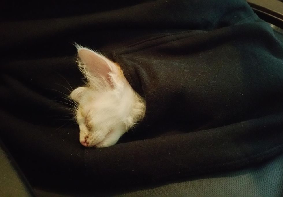 "My hoodie pocket seems to be his current favorite nap spot, while my shoulder seems to be his favorite spot while I'm walking around."