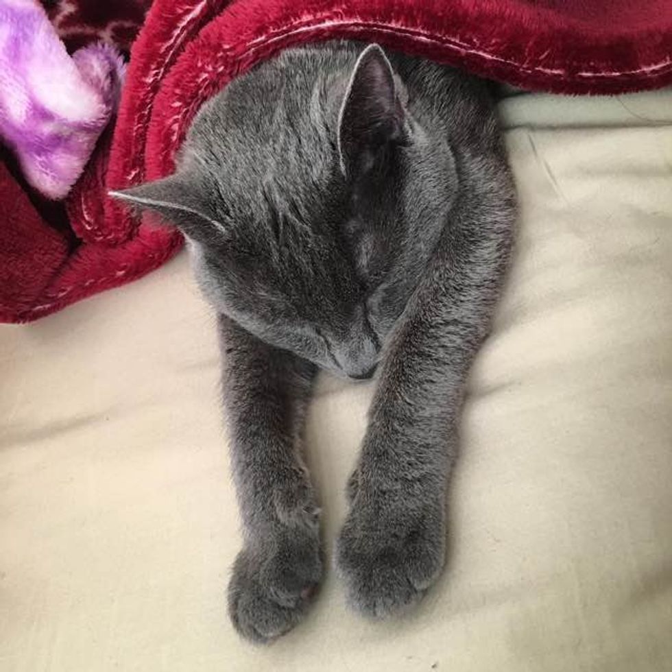 The kitty fell asleep in his rescuer's hand on the night he was rescued.