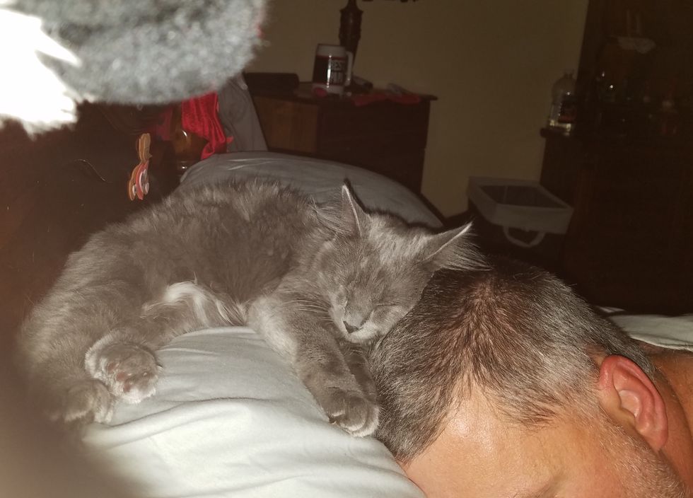 "He is the most affectionate kitty I have ever seen. He insists on laying on our heads, faces, necks, laps, etc. His motor is constantly on high as well."