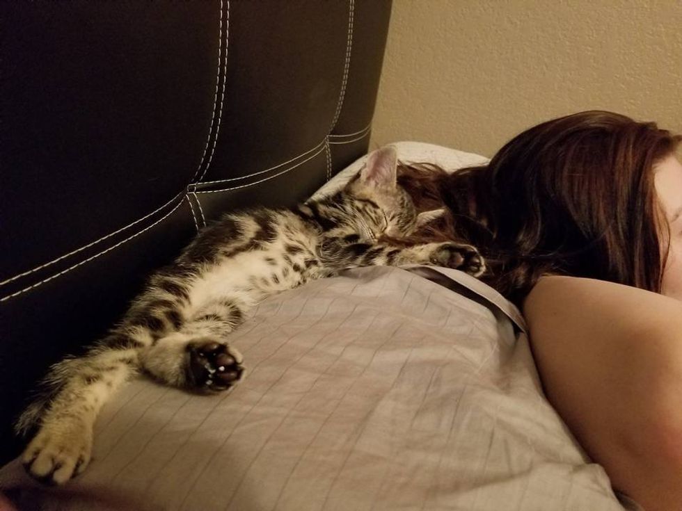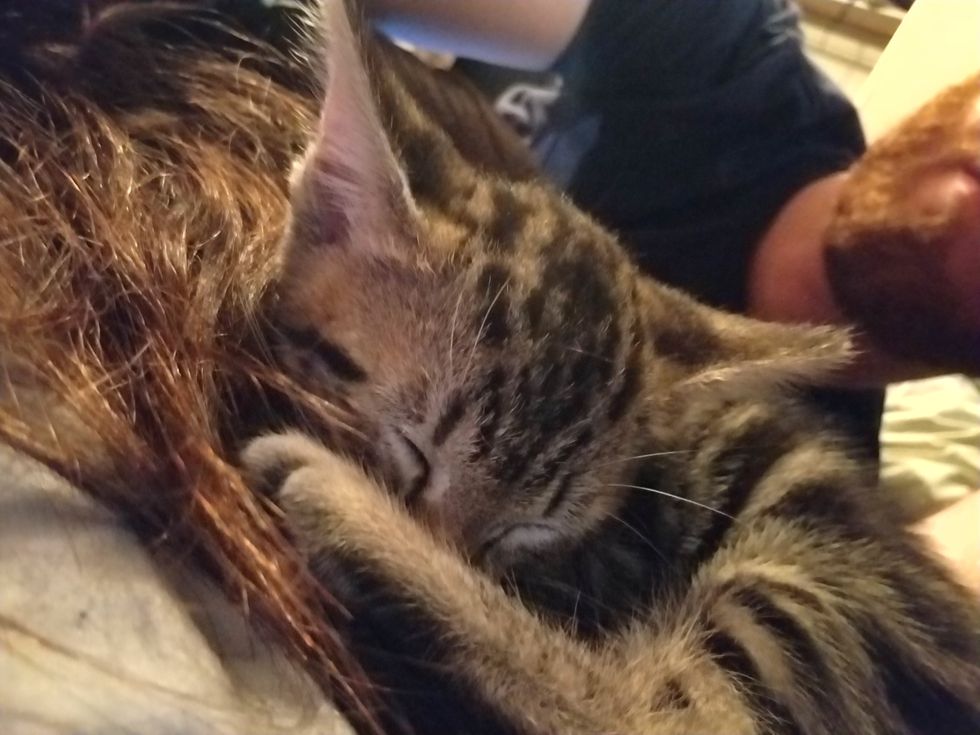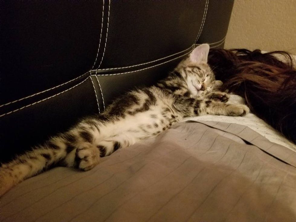 The kitten did play for a while but it was pure entertainment. "When he got tired he ended up laying next to my arm. I've discovered that he likes to sleep on his back with his legs stretched out. He also loves to sleep in my girlfriend's hair if he can."