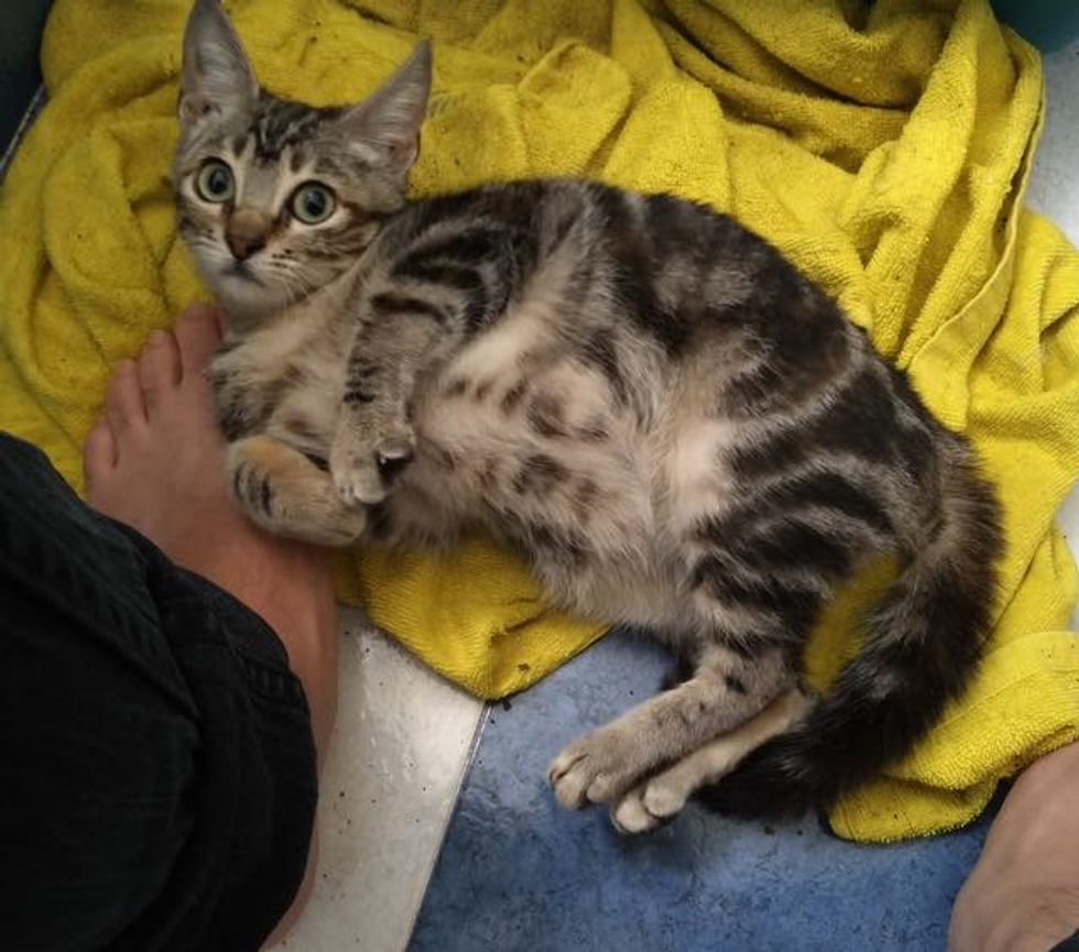 The little tabby cat dashed into some bushes to hide and was completely soaked and shivering. "She was just extremely scared and I grabbed her, fully expecting her bite. I held on and calmed her down and walked back to my car," Andrew said.