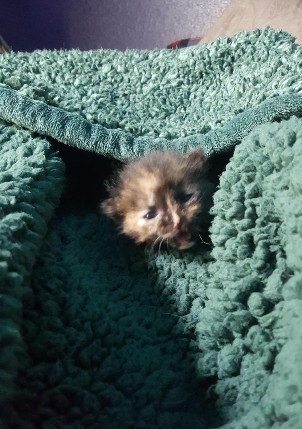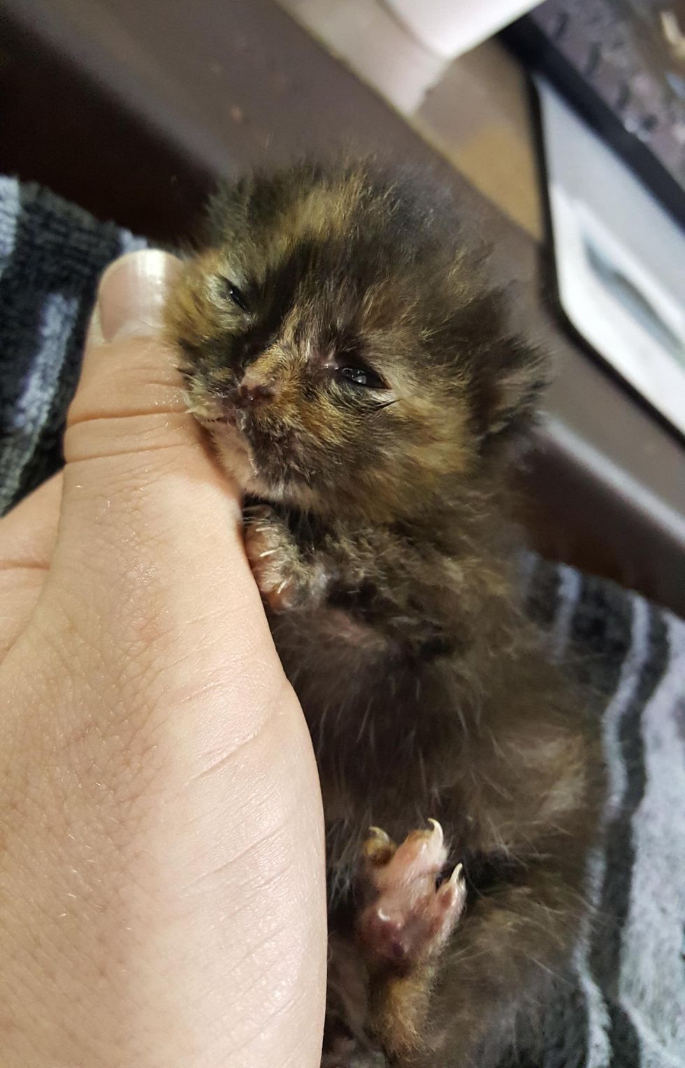 What he found was a tiny kitten still with her umbilical cord attached, eyes closed and she just kept crying and crying.