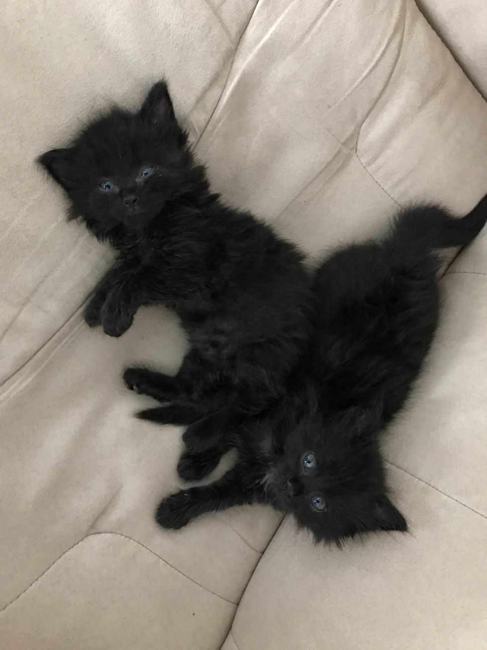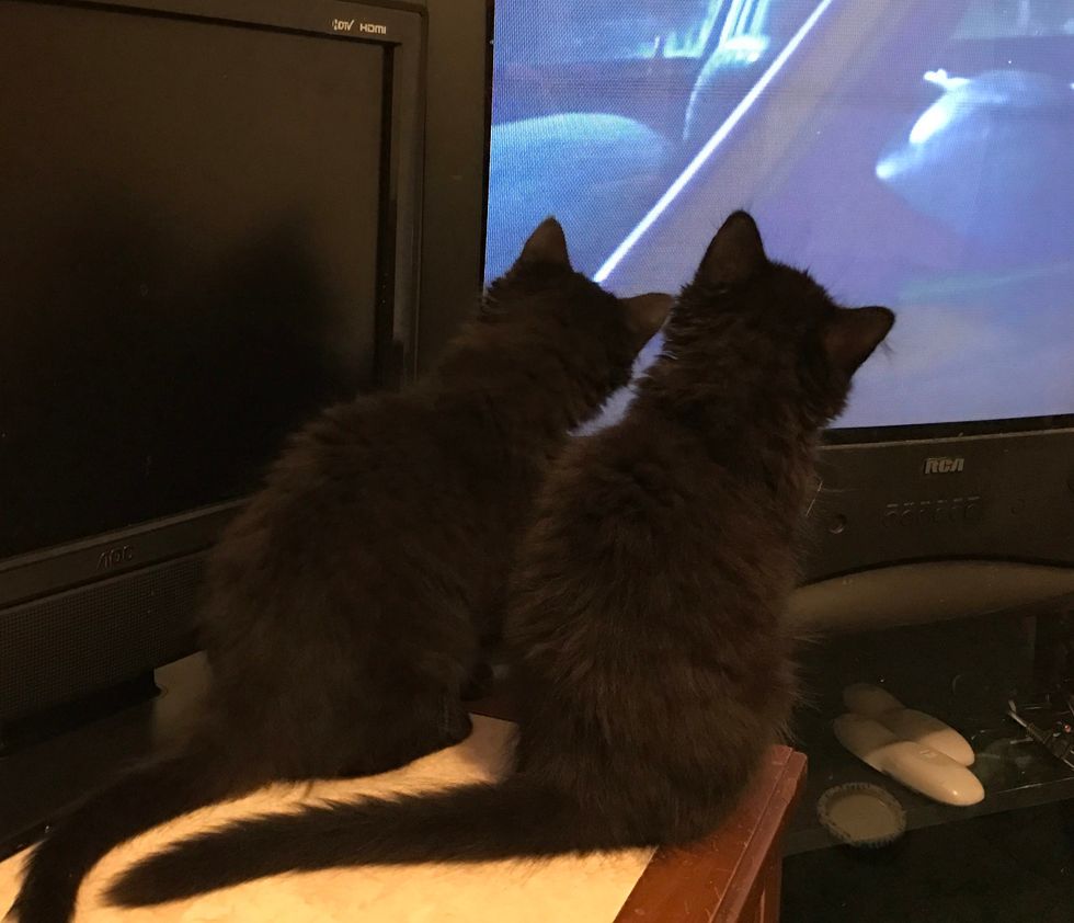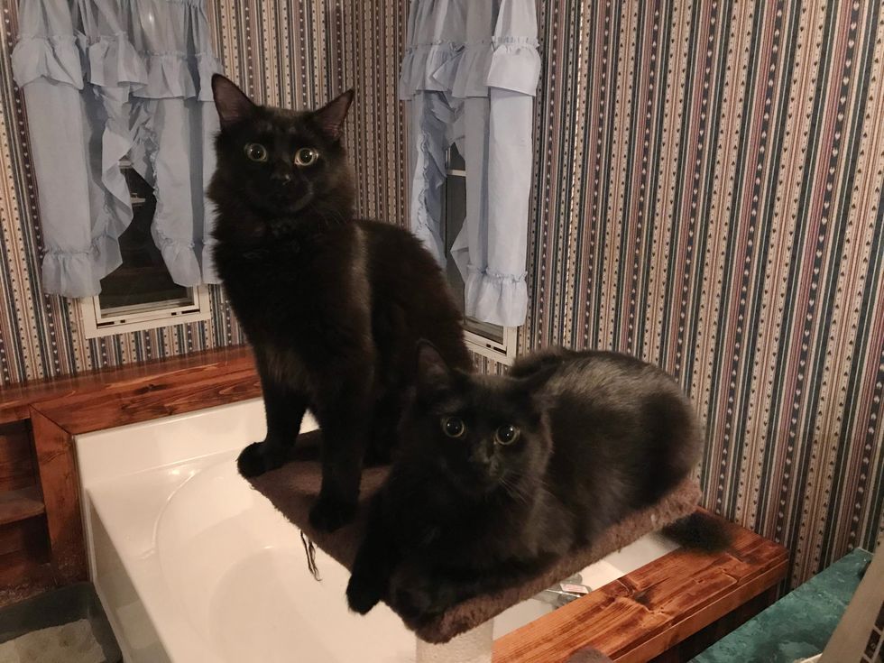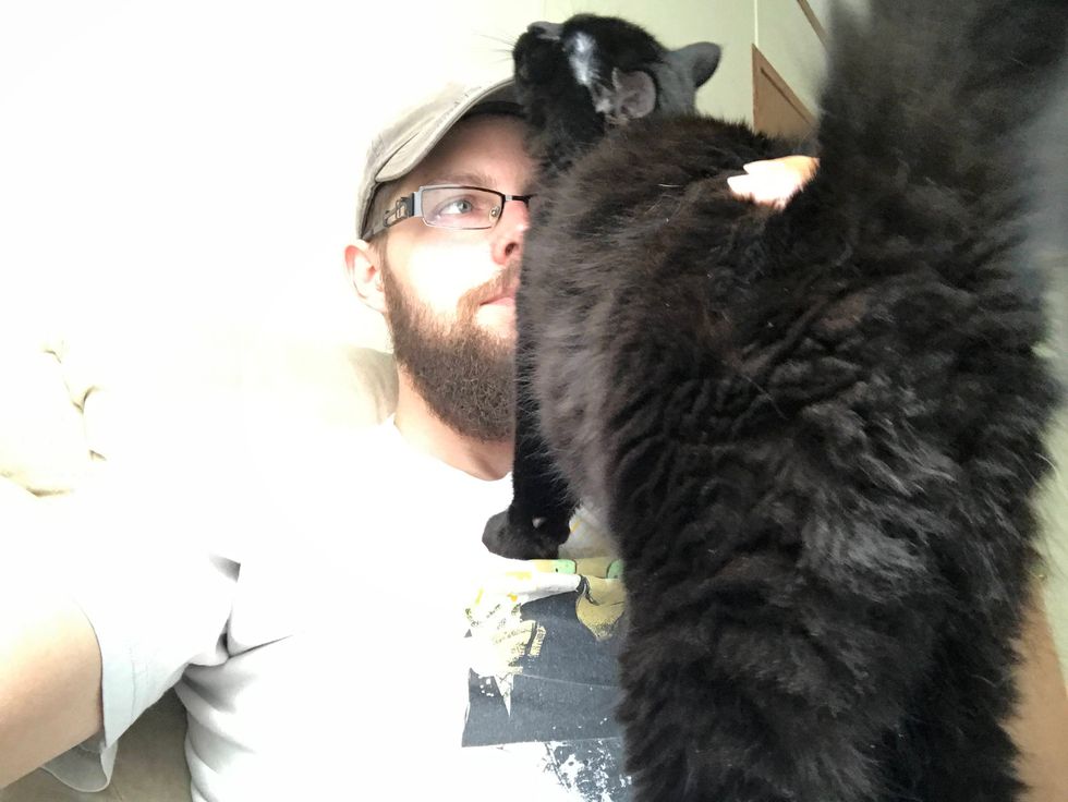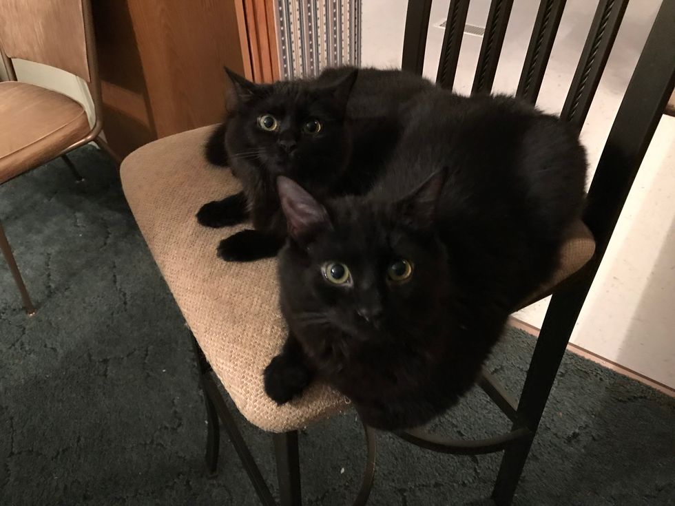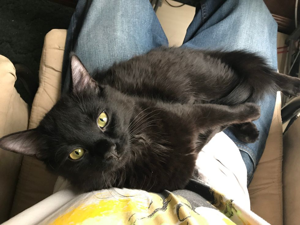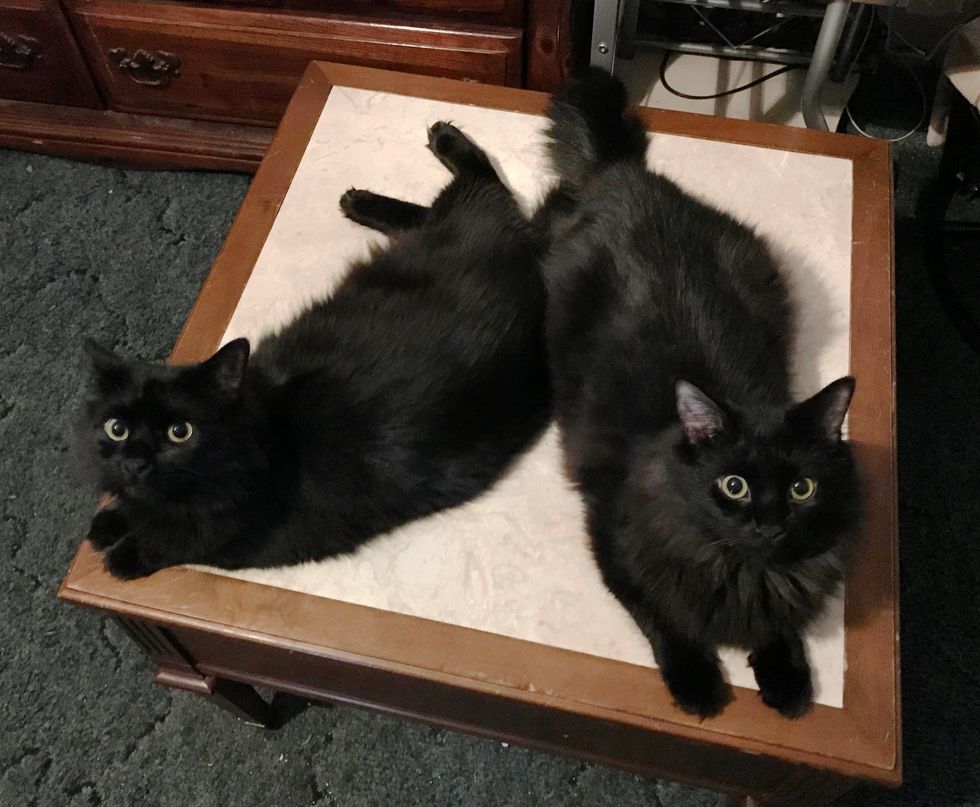 The two "panther" kitties snuggle with their human dad every single night. Whenever he sits at his desk or works from home, they will share his lap and keep him company.