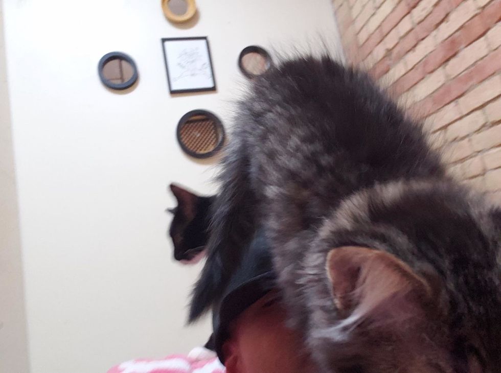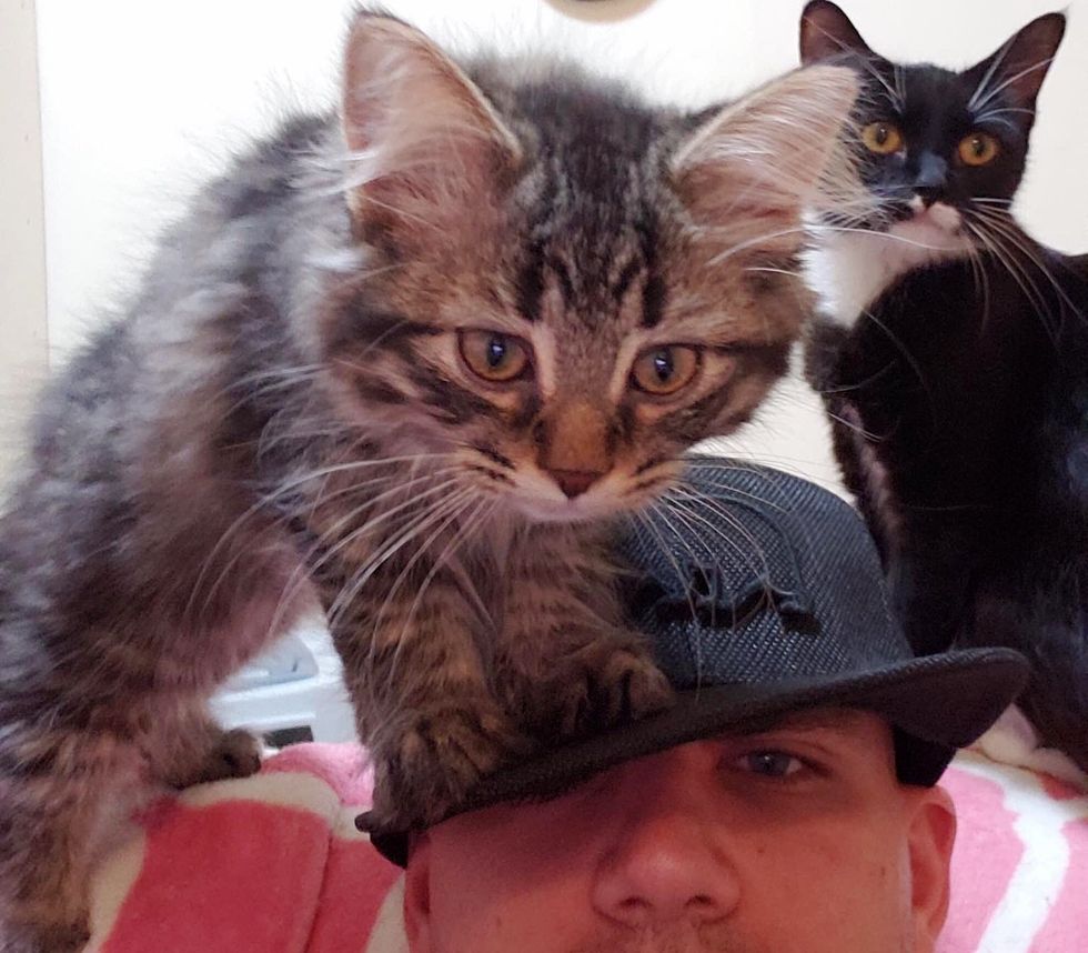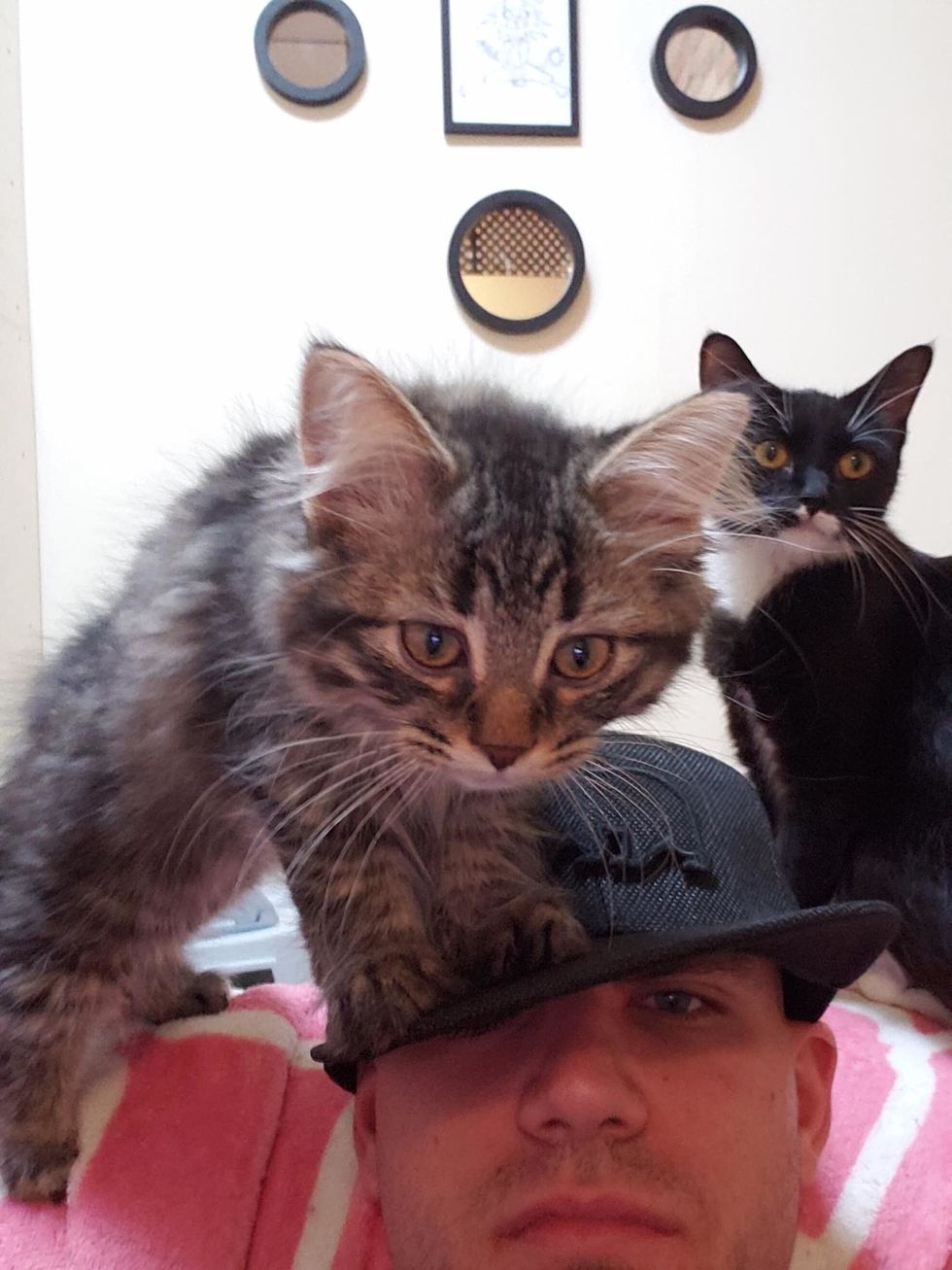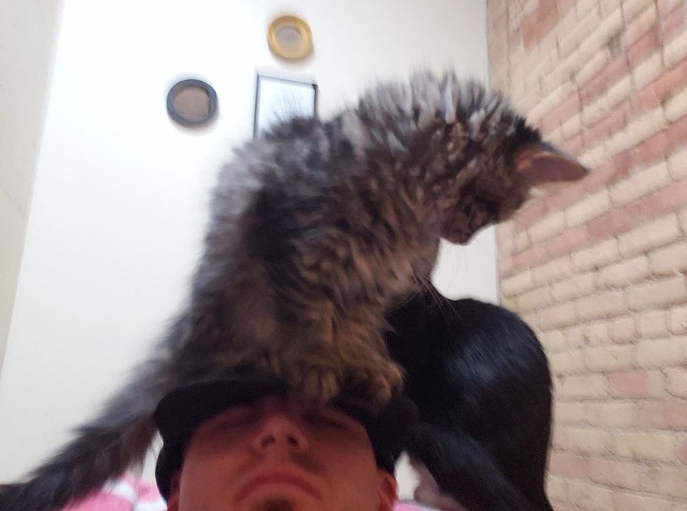 Cory gladly obliged and stayed still as the kitten sat down on the top of his head.