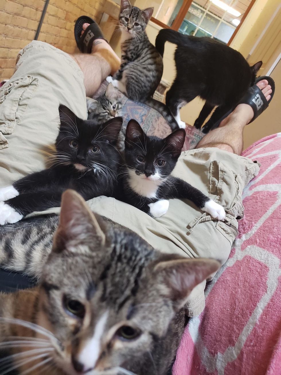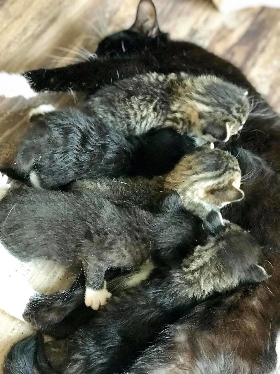 Suddenly, Cory found six little kittens making themselves comfortable on his lap.