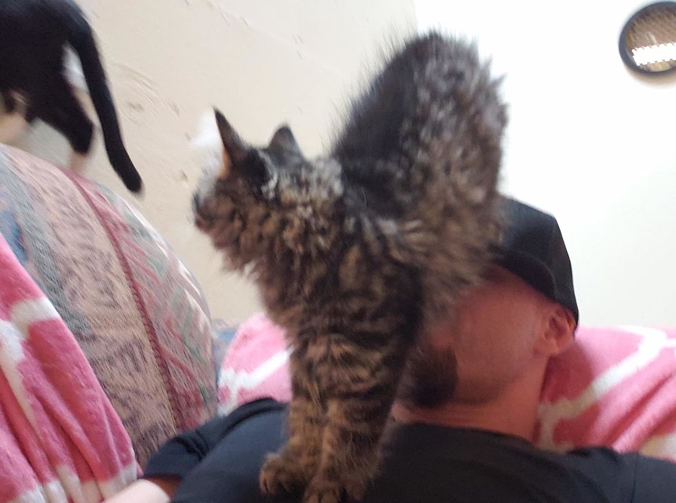 As he lay down on a couch, the fluffy tabby from the litter hopped right on and decided to climb up his shoulder.